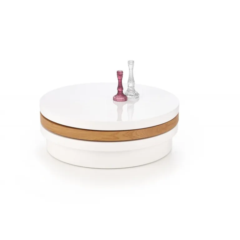 Oplev elegance og funktionalitet med MICHELLE c. bord i farven hvid og gyldne eg. Dette sofabord er perfekt til at tilføje et moderne touch til dit hjem. Med dimensionerne fi80/27 cm, passer det ideelt til både store og små rum. Materialet består af lakeret MDF og lamineret MDF, hvilket sikrer holdbarhed og en flot finish. Bordet leveres i en pakke, klar til nem samling derhjemme. Vægten på 39.000 kg garanterer en robust og stabil konstruktion.