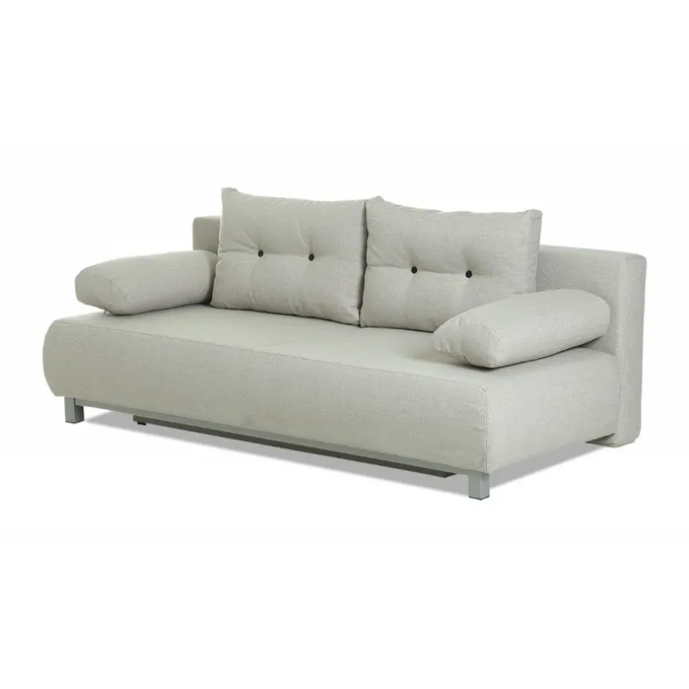 Mikado sovesofa med rummeligt magasin og udslånings funktion, som forvandler sofaen til en bekvemmelig soveplads for 2. Sofaen, der med sit smarte og unge design, egner sig særlig godt til teenageværelset. Mikado har springindlæg med en medium/hård liggekomfort. Sofaen er betrukket med et lyst og slidstærkt, strukturvævet møbeltekstil med mørke knapper og hævet på stabile metal ben.