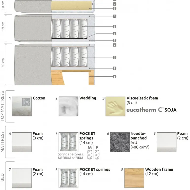 De gode egenskaber ved gennemtestede fibre og moderne Eucatherm C SOJA-materiale sikrer enestående sovekomfort. Den højkvalitets topmadras MILENA er lavet af bomuld, vat og det forbedrede viskoelastiske skum “Eucatherm C SOJA” 5 cm af ny generation, en af komponenterne i dette materiale er erstattet af sojaolie. Sidstnævnte moderne viskoelastiske materiale resulterer i god luftgennemtrængelighed og optimal varmevedligeholdelse. Derudover er det i stand til at reducere trykket af kropsvæv på punkter med maksimalt tryk. I mellemtiden beskytter uld og bomuld kroppen mod overophedning og forkølelse på forskellige tidspunkter af året. Topmadrassen er 10 cm tyk.