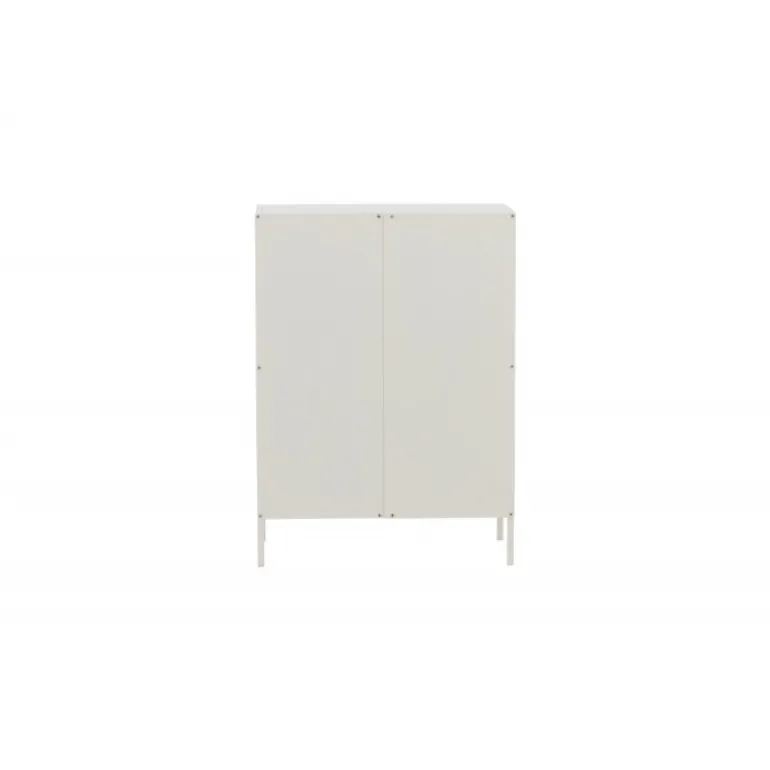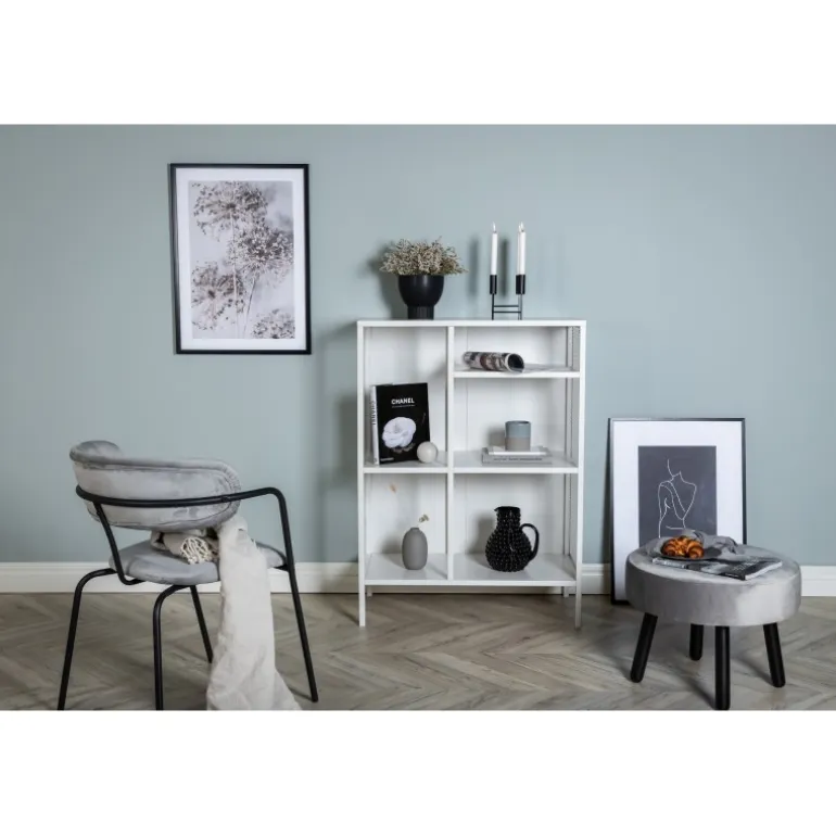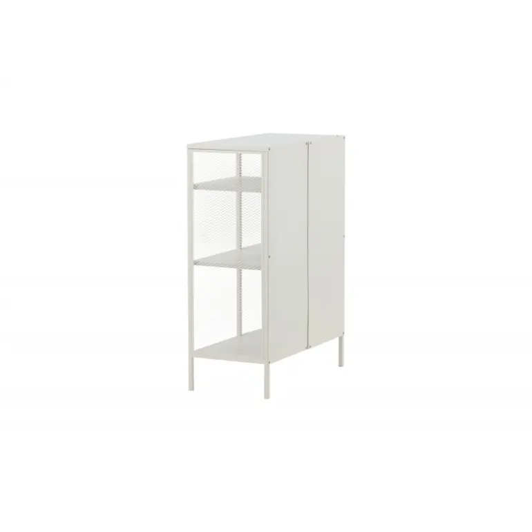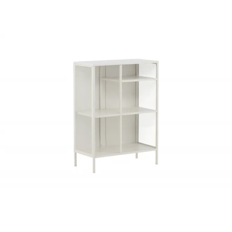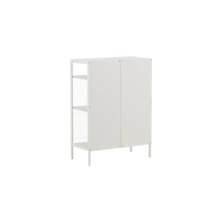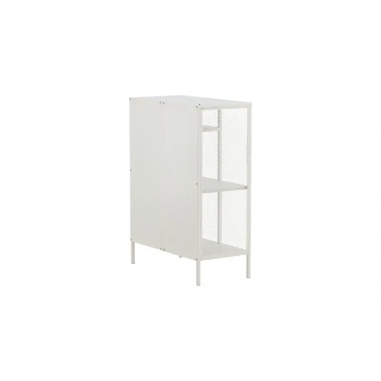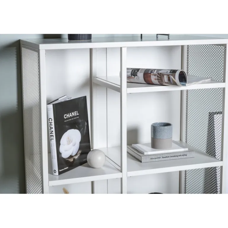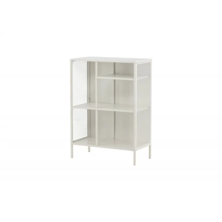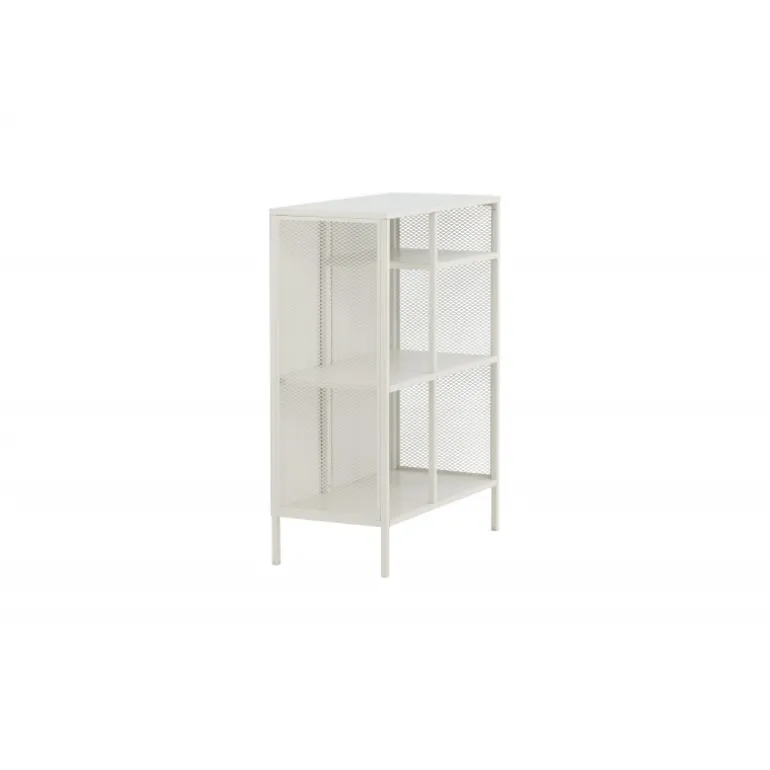 Misha hylde er designet i et robust industrielt look, fremstillet af pulverlakeret hvidt stål med tre opbevaringsflader i forskellige højder. Siderne af skabet har net for et ekstra touch, og det står på fire pulverlakerede hvide stålben. Dimensioner: Længde: 80 cm, bredde: 40 cm, højde: 110 cm. Lettere samling er påkrævet.