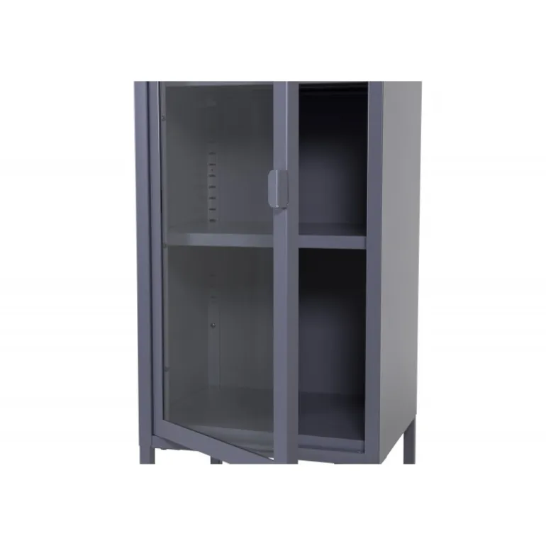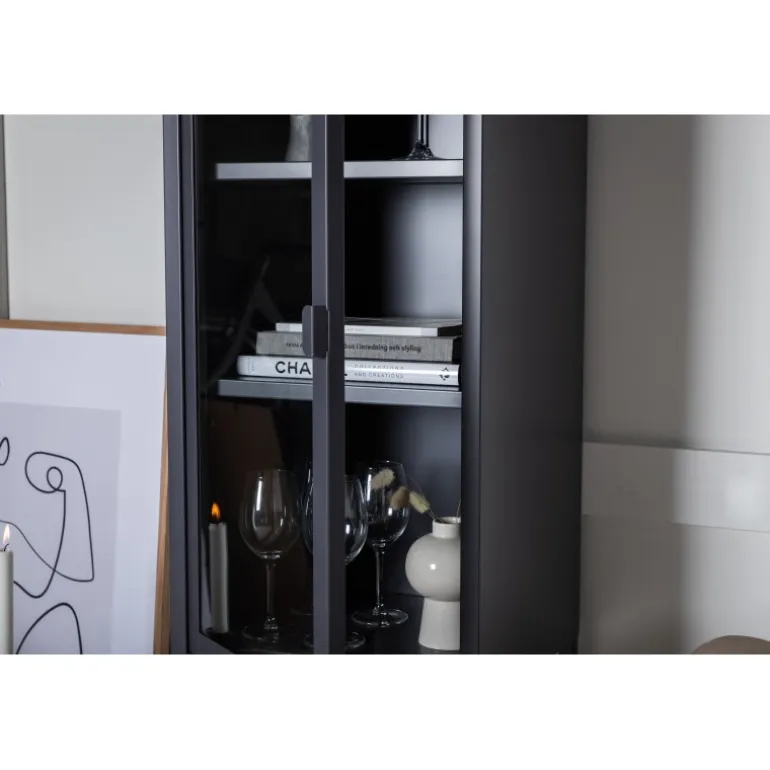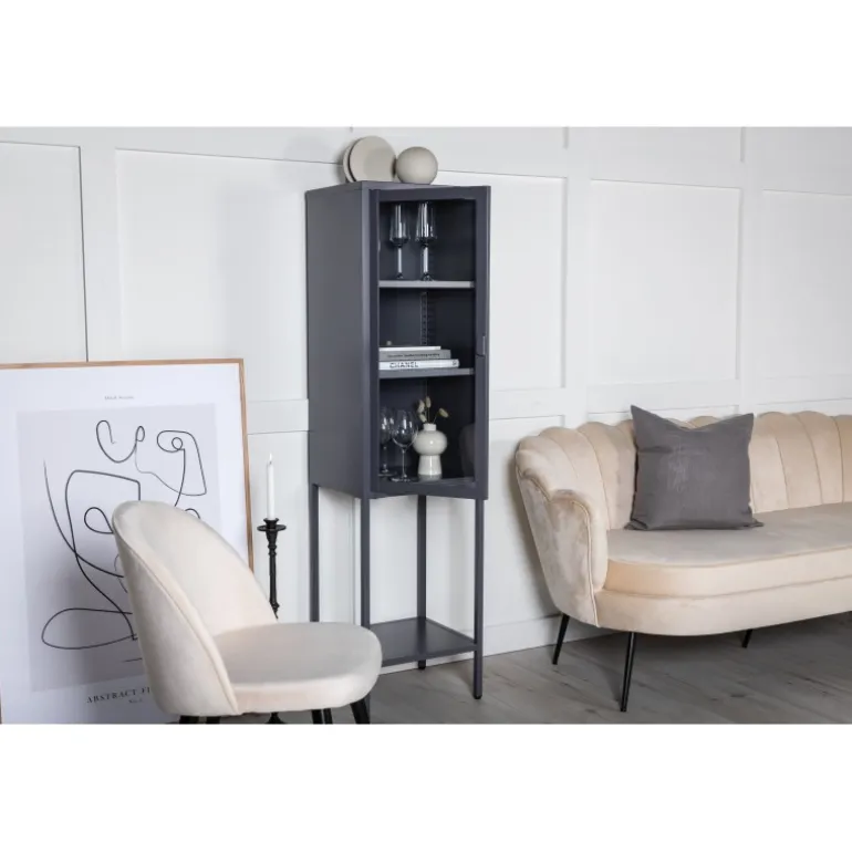Sheet kabinetter er en populær og praktisk tilføjelse til indretningen! Dette kabinet i Misha-serien har en statelig højde med et moderne industrielt design, lavet af pulverlakeret grå stål med en glasdør. Glasset lader lyset strømme ind i kabinettet og fremhæver smukt alt, hvad du fylder det med. Der er tre smarte hylder, som kan bruges til opbevaring af porcelæn, bøger eller dekoration med smukke indretningsdetaljer. Dimensioner: Længde: 40,5 cm, bredde: 35 cm, højde: 150 cm. Let montering kræves. Plejeanbefalinger: Aluminium og krom er to materialer, der afviser snavs og væsker. Vær dog opmærksom på, at vand kan forårsage pletter og rust. Tør derfor overfladen af med en blød, fugtig klud og sæbevand. Hvis pletterne eller rusten sidder for hårdt, anbefales en blød klud fugtet i ren alkohol.