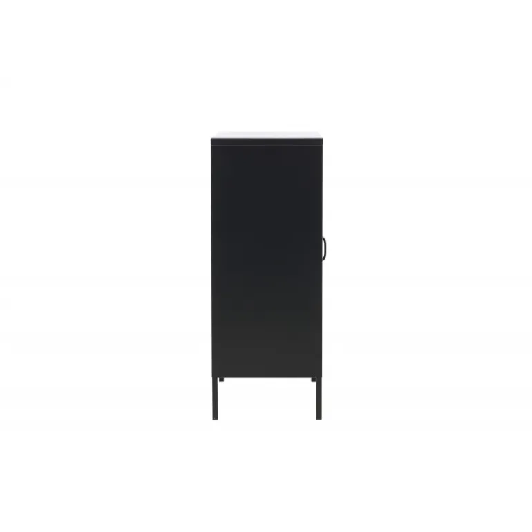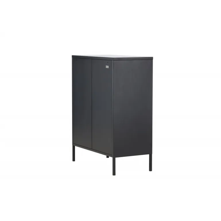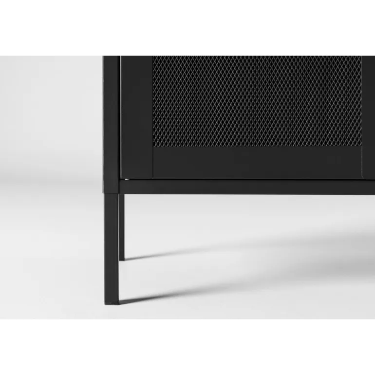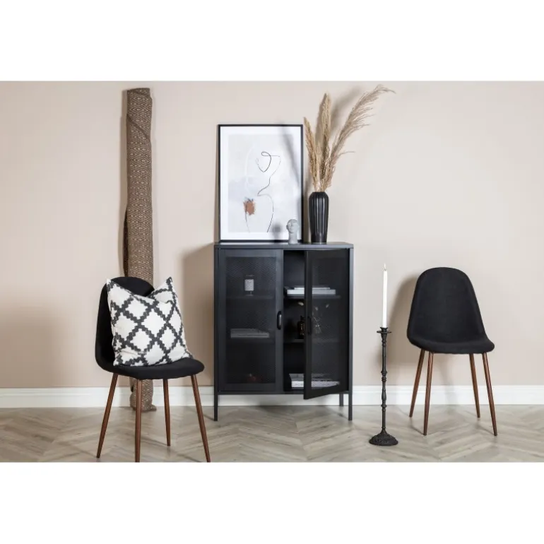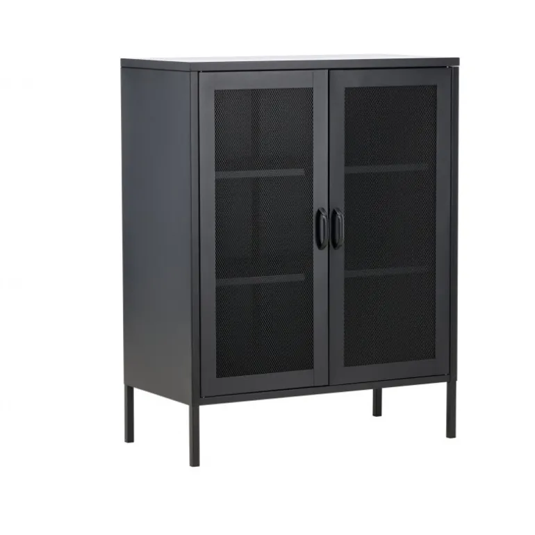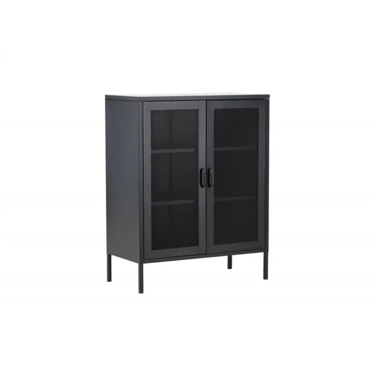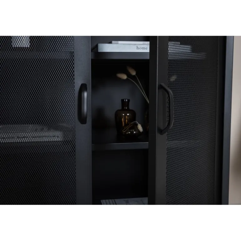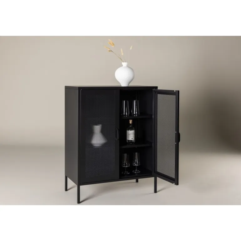 Misha, i et robust industrielt design med lækre mesh-døre og ben lavet af sort pulverlakeret stål med 3 smarte relief overflader. Skabet løftes af smalle, høje ben, der skaber en luftig følelse og gør det let at støvsuge under. Den perfekte opbevaringsmøbel til alt, hvad du ønsker – fyld det med porcelæn, bøger eller smukke dekorationer. Den fleksible størrelse på skabet gør det nemt at placere og passer godt ind i de fleste rum i hjemmet, så indret efter dine egne behov og ønsker! Plejeråd: Aluminium og krom er to materialer, der afviser snavs og væsker. Vær dog opmærksom på, at vand kan forårsage pletter og rust. Sørg derfor for at tørre overfladen med en blød fugtet klud og sæbevand. Hvis pletterne eller rusten sidder for fast, anbefales en blød klud fugtet i ren alkohol.