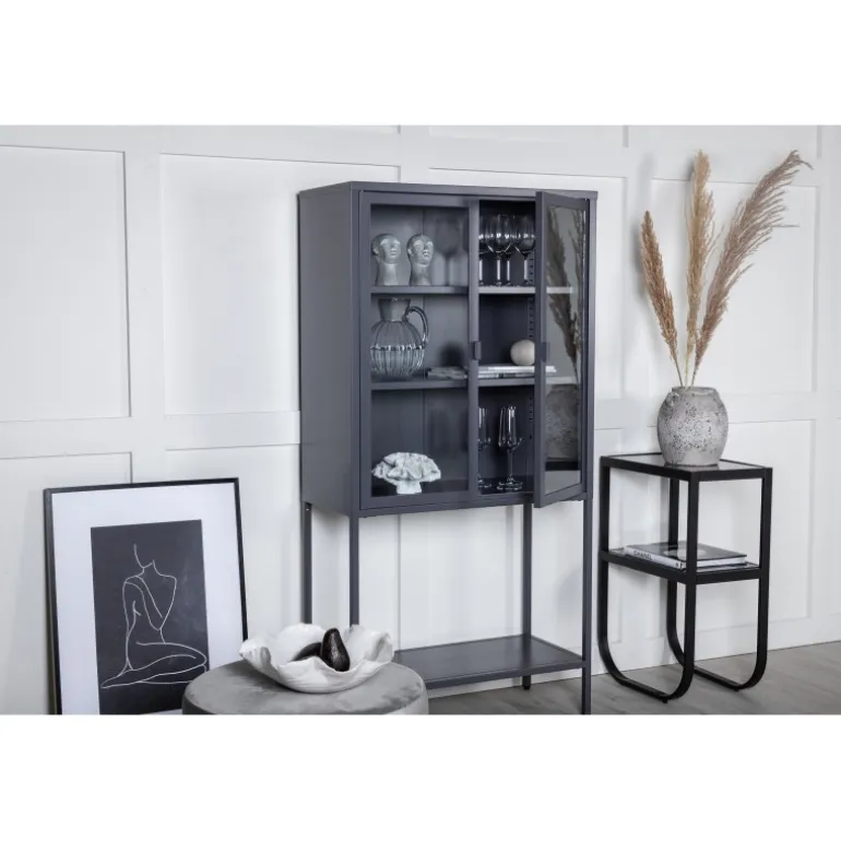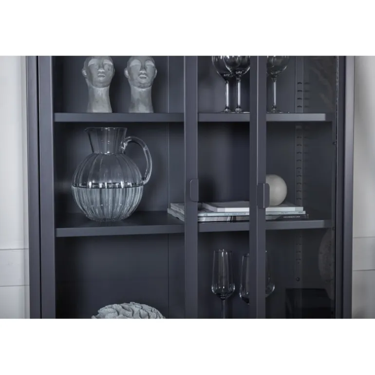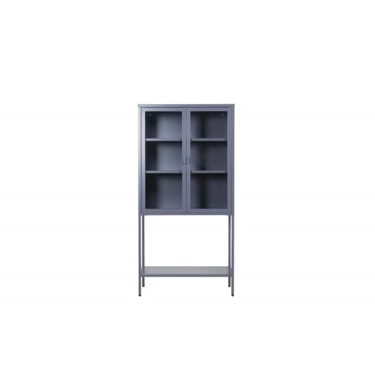 Misha Skab er en elegant opbevaringsmøbel med et praktisk og stilfuldt design! Misha, i moderne nordisk design med rene linjer, er lavet af pulverlakeret grå stål med to glasdøre, der giver et smukt lysindfald. Skabet har en imponerende højde, der åbner rummet og skaber en trendy atmosfære. Dette vitrineskab er yderst anvendeligt. Der er tre hylder, som du kan fylde efter dine egne behov og ønsker – smukt porcelæn, bøger eller stilfulde interiørdetaljer – valget er dit! Se vores billeder for inspiration. Lettere samling er påkrævet. Plejeråd: Aluminium og krom er to materialer, der afviser snavs og væsker. Du skal dog være opmærksom på, at vand kan forårsage pletter og rust. Sørg derfor for at tørre overfladen af med en blød, fugtig klud og sæbevand. Hvis pletterne eller rusten sidder for hårdt, anbefales en blød klud fugtet i ren alkohol.