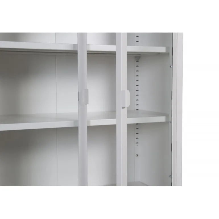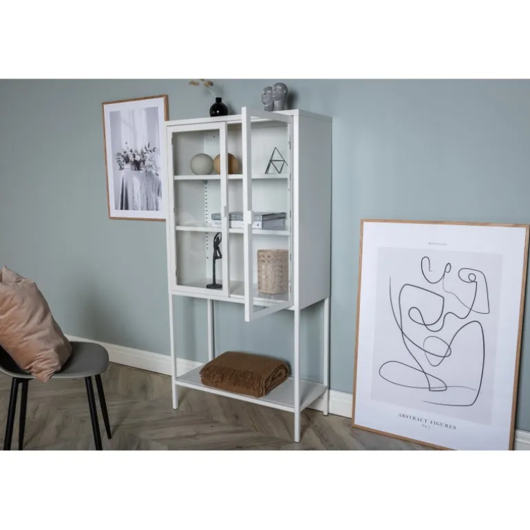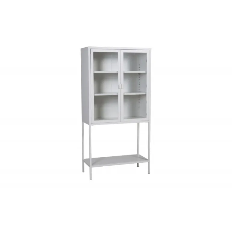 Et elegant opbevaringsmøbel med praktisk og stilfuldt design! Misha, i moderne nordisk stil med lige linjer, er lavet af hvid pulverlakeret stål med to glasdøre for dejligt lysindfald. Skabet har en imponerende højde, der åbner rummet og skaber en trendy, lys atmosfære. Dette vitrineskab er yderst anvendeligt. Der er tre hylder til opbevaring, som du kan fylde efter dine egne behov og ønsker – smukt porcelæn, bøger eller stilfulde interiørdetaljer – valget er dit! Se vores billeder for inspiration. Lettere samling kræves. Plejevejledning: Aluminium og krom er to materialer, der afviser snavs og væsker. Dog skal du være opmærksom på, at vand kan forårsage pletter og rust. Sørg derfor for at tørre overfladen af med en blød, fugtig klud og sæbevand. Hvis pletterne eller rusten sidder for hårdt, anbefales det at bruge en blød klud fugtet med ren alkohol.