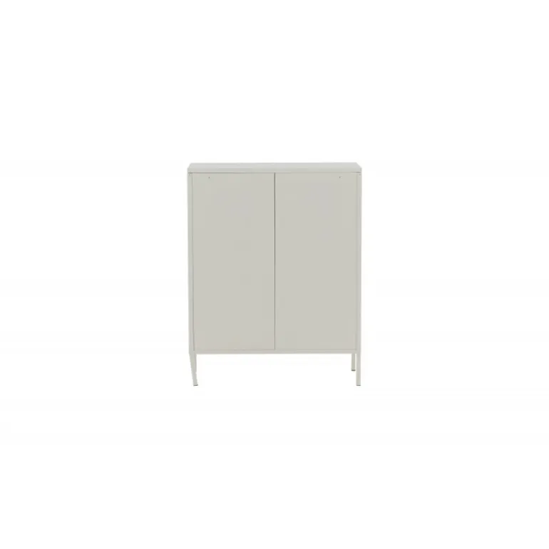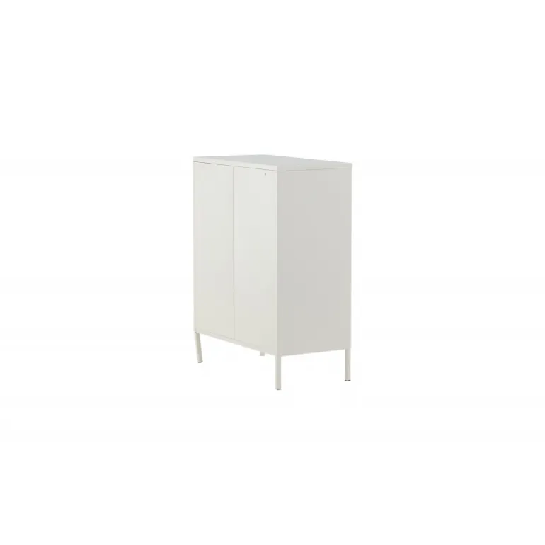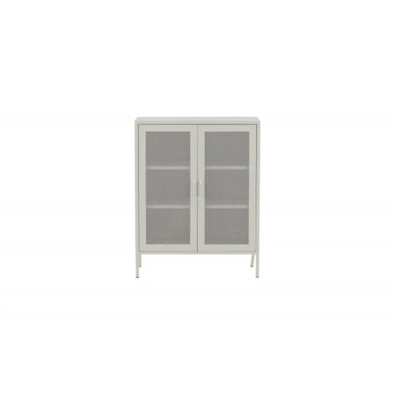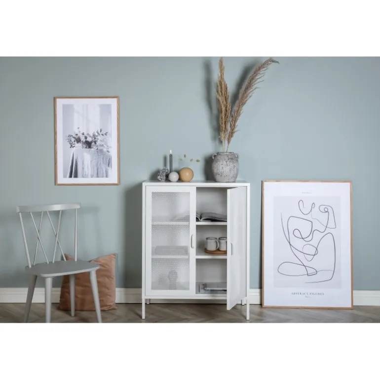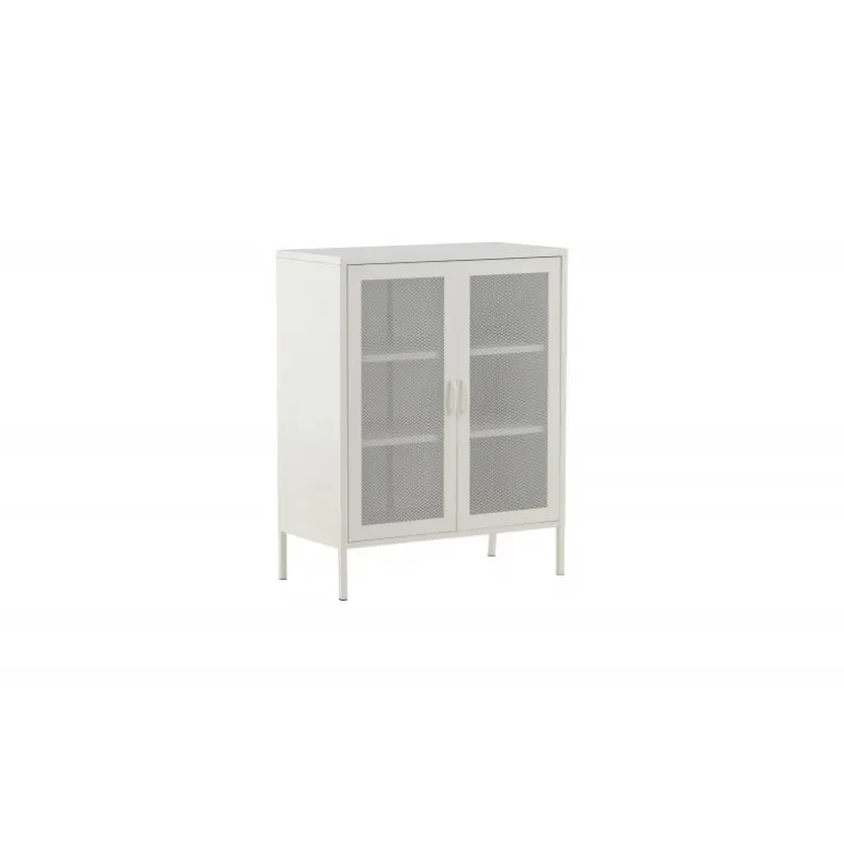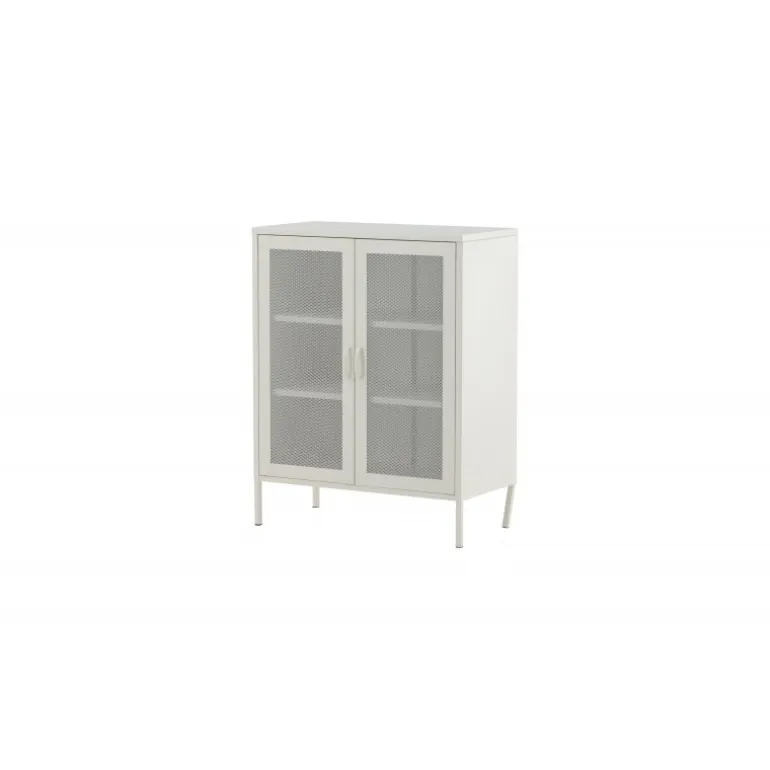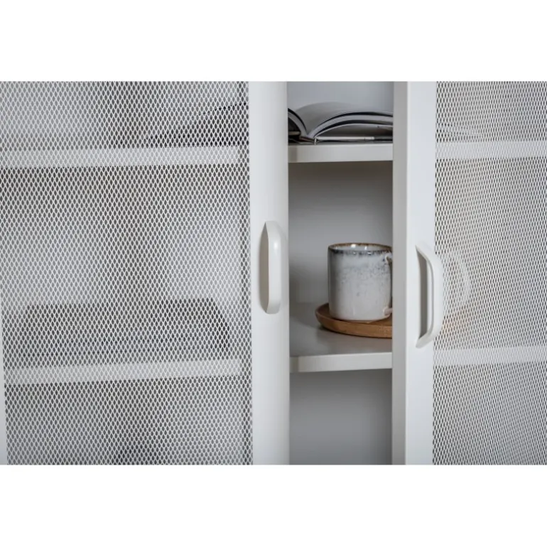 Misha, i et robust industrielt design med lækre mesh-døre og ben i hvid pulverlakeret stål, har 3 smarte hylder til opbevaring. Skabet løftes af slanke, høje ben, der skaber en luftig følelse og gør det lettere for støvsugeren at komme til. Det perfekte opbevaringsmøbel til alt det, du ønsker – fyld det med porcelæn, bøger eller smukke dekorationer. Den fleksible størrelse og elegante udseende gør det nemt at placere og passer godt ind i de fleste rum i hjemmet, så indret efter dine egne behov og ønsker! Plejeråd: Aluminium og krom er to materialer, der afviser snavs og væsker. Bemærk dog, at vand kan forårsage pletter og rust. Derfor skal du sørge for at tørre overfladen af med en blød, fugtet klud og sæbevand. Hvis pletterne eller rusten sidder for hårdt, anbefales en blød klud fugtet i ren alkohol.