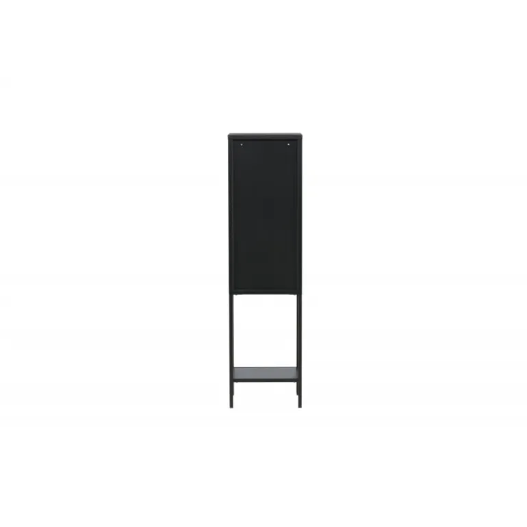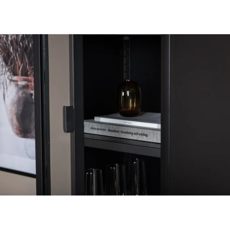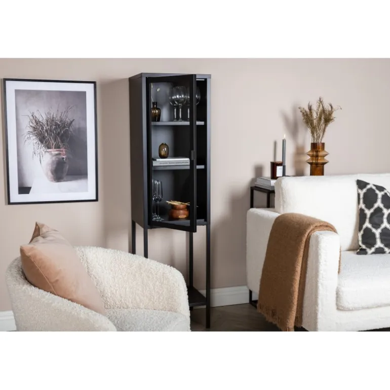 Sheet-skabe er en populær og praktisk tilføjelse til interiøret! Dette skab i Misha-serien har en statelig højde i moderne industrielt design, lavet af pulverlakeret sort stål med en glasdør. Glasset lader et dejligt lys ind i skabet og fremhæver smukt alt, hvad du fylder det med. Der er tre smarte hylder, som kan bruges til at opbevare porcelæn, bøger eller dekorere med smukke interiørdetaljer. Dimensioner: Længde: 40,5 cm, bredde: 35 cm, højde: 150 cm. Lettere samling er påkrævet. Plejeanvisning: Aluminium og krom er to materialer, der afviser snavs og væsker. Du skal dog være opmærksom på, at vand kan forårsage pletter og rust. Sørg derfor for at tørre overfladen af med en blød fugtet klud og sæbevand. Hvis pletter eller rust sidder for hårdt, anbefales en blød klud fugtet i ren alkohol.