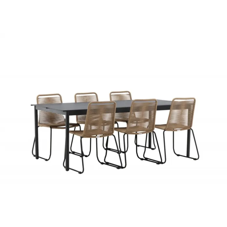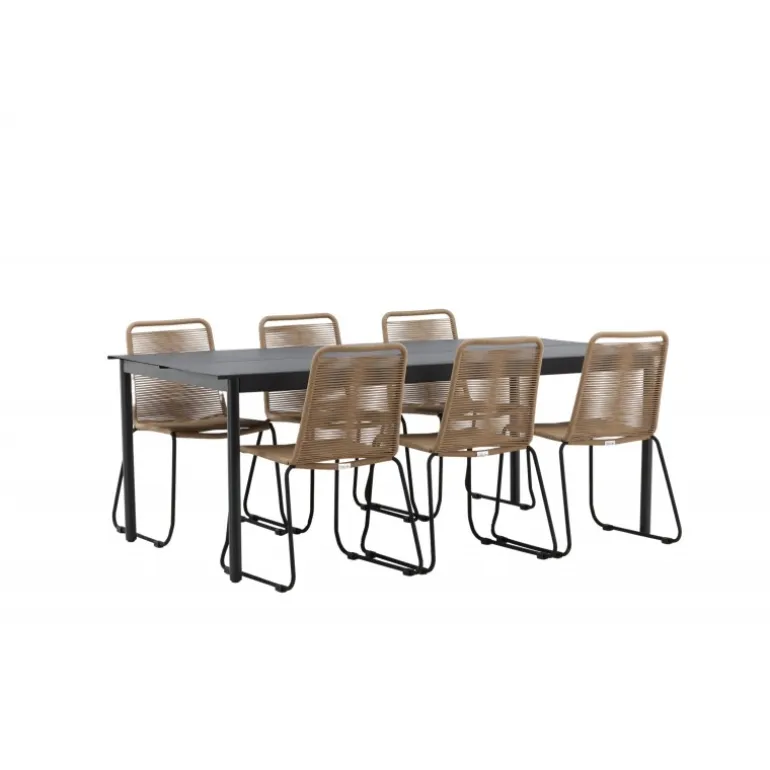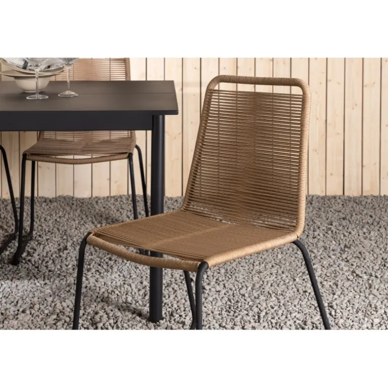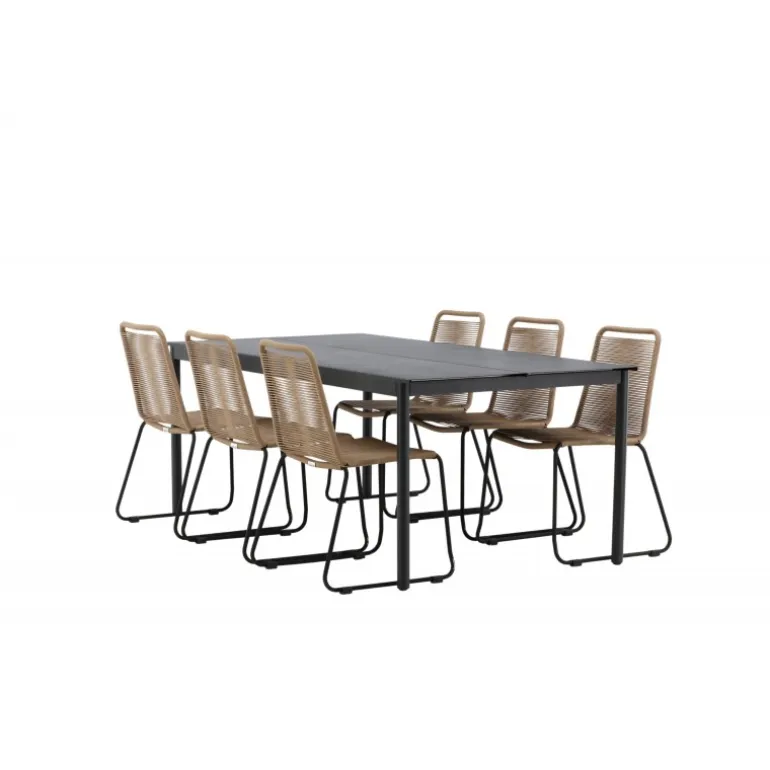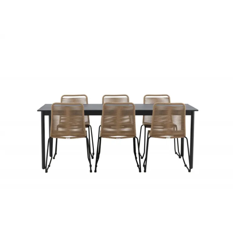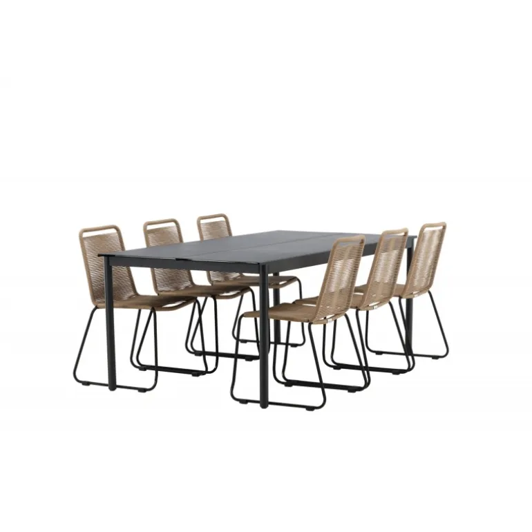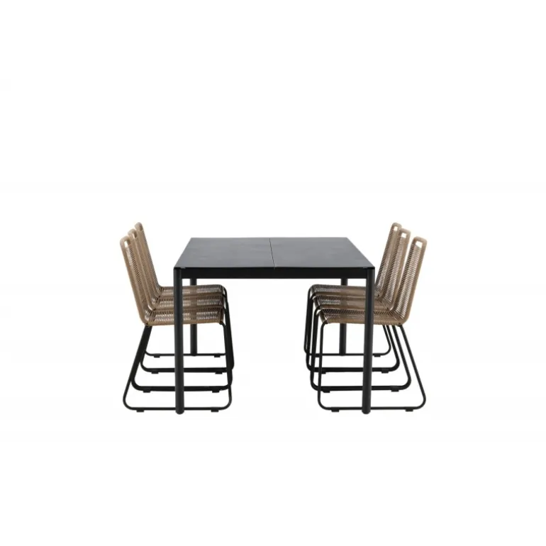 Inviter til mange sociale begivenheder i fremtiden! Modena er vores populære spisebord i lige, nordiske former, som rummer plads til mange. Bordet har en rektangulær bordplade i sort aluminium og cylindriske ben i minimalistisk stil. Her i en modebevidst kombination med vores lækre spisestole Lindos i jordfarver. Stolene kan stables for praktisk opbevaring og er lavet af holdbart reb i en dejlig lattefarve. Sid komfortabelt og hyggeligt i en indbydende Loungesæt – Havemøbelsæt!