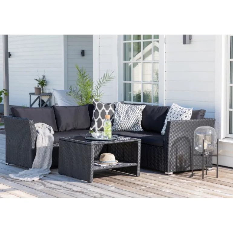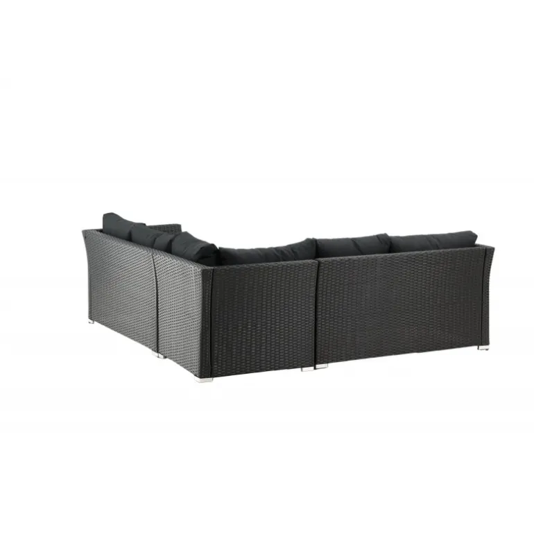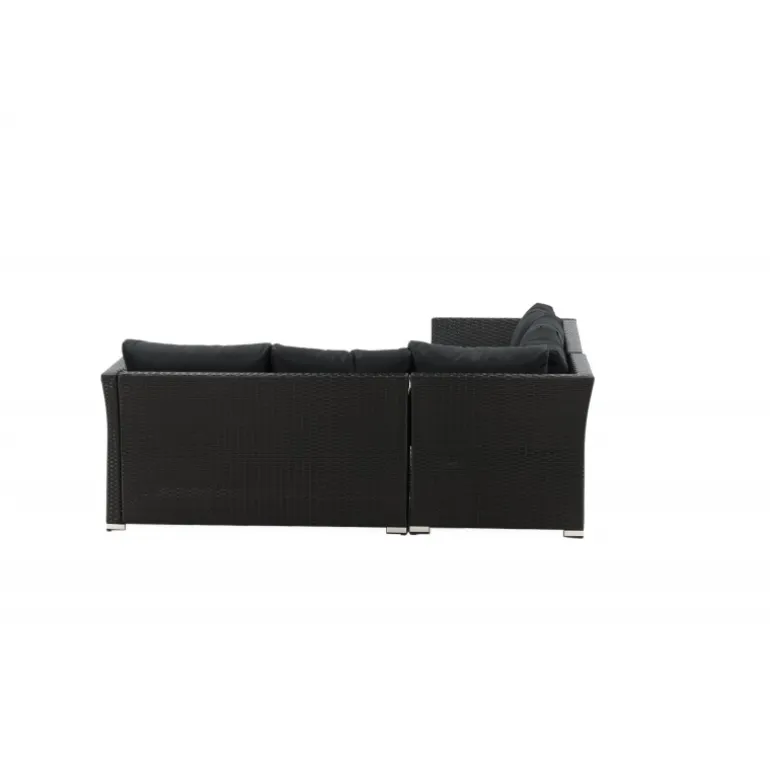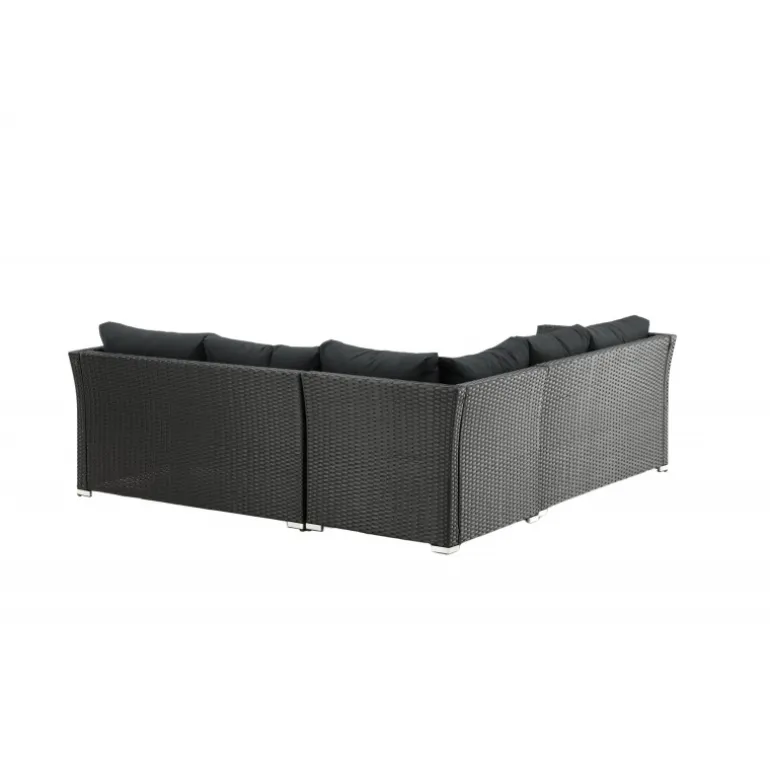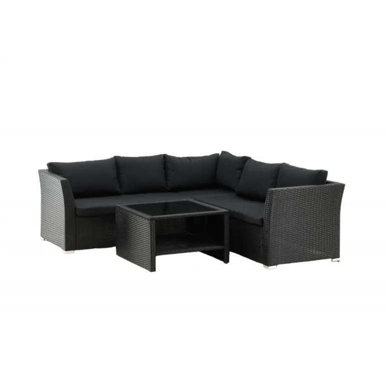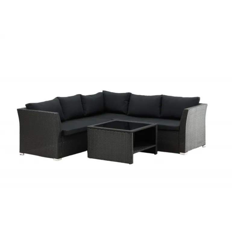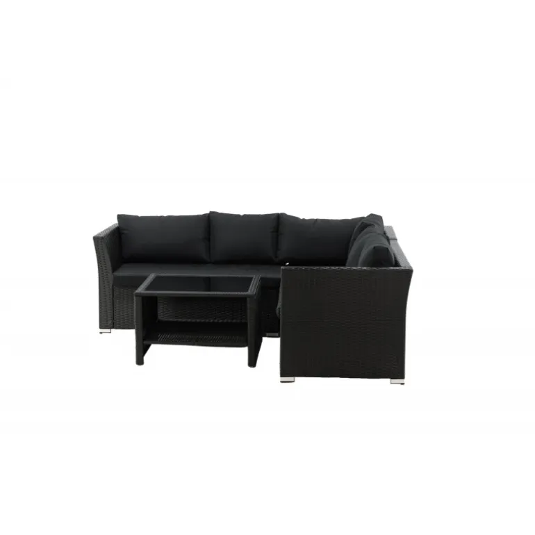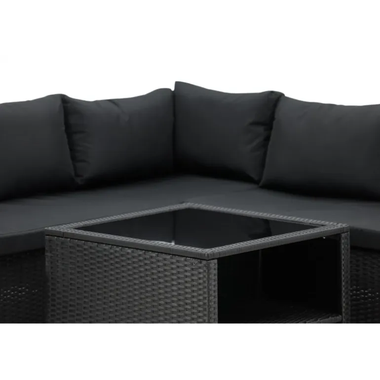 Moderne loungesæt i sort kunstig rattan af høj kvalitet til terrassen eller altanen. Loungesæt – Havemøbelsættet består af en modulbaseret hjørnesofa med 4 sæder og en hjørnesektion, hvilket gør det muligt at placere det på flere måder. Inkluderer bløde sorte puder samt et rektangulært sofabord med en reliefhylde og en sort glasbordplade. Dimensioner: 194×194 cm. Let montering kræves.