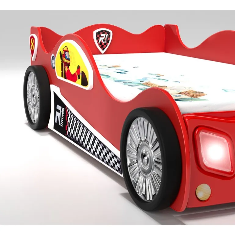 Vælg mellem fire farver og lad dit barn få sin helt egen personlige racerseng med lys og karakter – perfekt til både drenge og piger med fart og fantasi i blodet!