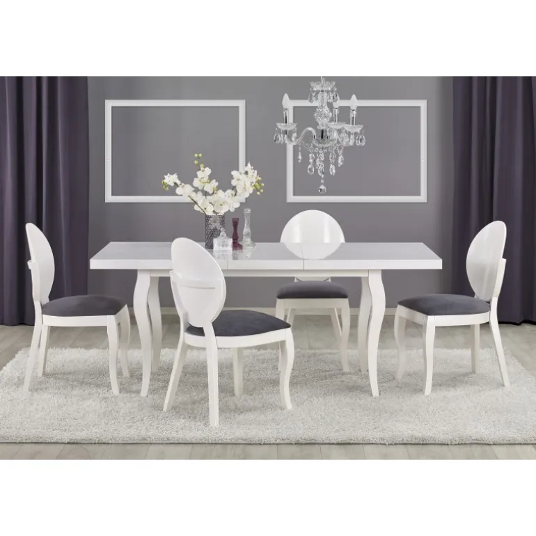 MOZART 160-240 Spisebord med udtræk er det perfekte valg til din spisestue eller køkken. Dette bord kombinerer stil og funktionalitet med sin højkvalitets laminerede MDF top og solide bøgetræ ben. Med justerbare dimensioner fra 160 cm til 240 cm, kan du nemt tilpasse bordet til forskellige lejligheder, fra intime middage til større sammenkomster. Den hvide farve giver et moderne og elegant udseende, der passer til enhver indretning.