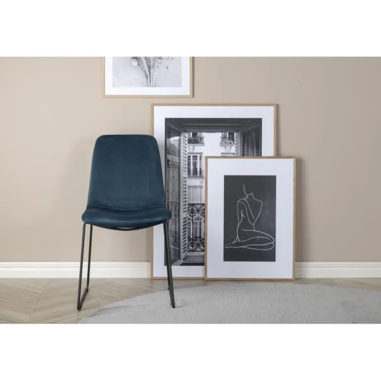 En diskret farveprik, der vil løfte dit interiør til næste niveau! Denne elegante spisebordsstol fra Muce-serien har slanke ben i sort pulverlakeret metal. Ryglænet er blidt afrundet og fuldt polstret i blåt fløjlstof. Lad dette øjeblik være dagens højdepunkt! Nogle dele skal samles. Plejeinstruktioner: Brug tekstilspray til at imprægnere stoffet før brug; dette vil også gøre det lettere at fjerne snavs og pletter i fremtiden. Fjern pletter straks, gnid ikke, men forsøg at duppe dem forsigtigt op med en klud.