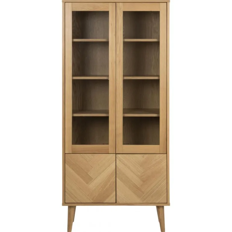 Nagano vitrine massiv/finer eg, lak, glaslåger 2 stk låger sildeben 2 stk L:80 B:37 H:178 cm