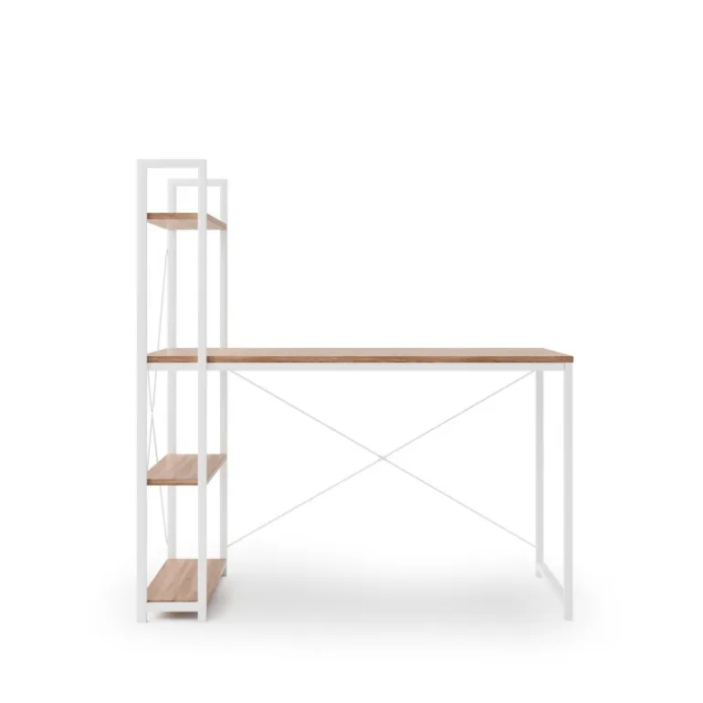 NARVIK B1 skrivebord i hvid og sonoma eg er den perfekte løsning til både hjemmekontoret og studieværelset. Med dimensionerne 120/64/120 cm passer det i de fleste rum. Skrivebordet er fremstillet af lamineret spånplade og pulverlakeret stål, hvilket sikrer holdbarhed og et moderne udseende. Den praktiske reol kan monteres på både venstre og højre side, hvilket giver fleksibilitet til at tilpasse arbejdsområdet efter behov.