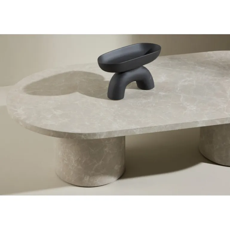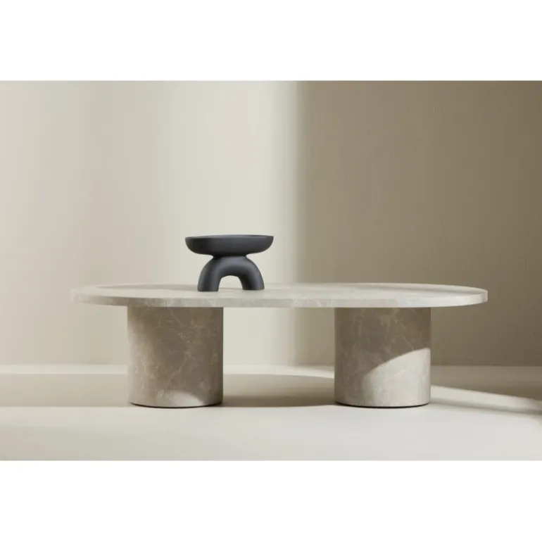 Narvik sofabordet kombinerer moderne minimalisme med et eksklusivt udtryk. Den ovale bordplade hviler på to cylinderformede søjleben, som giver en stabil og skulpturel form. Den varme beige marmorlook-overflade tilfører rummet et roligt og luksuriøst præg.
