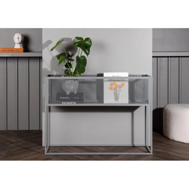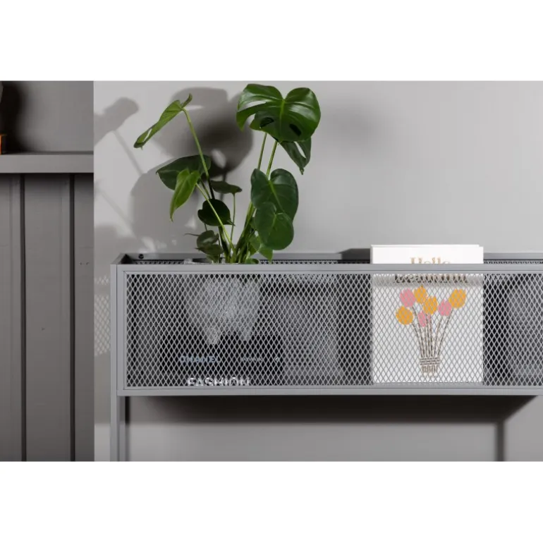 Indret hjemmet moderne og smart med hjælp af Netz relief hylde! Denne lækre sidebord/hylde har et slankt industrielt design med en hylde til opbevaring, net sider rundt om hele opbevaringsfladen og smalle høje ben i gråt stål. Den fleksible størrelse og elegante ydre gør det nemt at placere og passer godt ind i de fleste rum i hjemmet, så indret efter dine egne behov og ønsker og dekorer med smukke dekorationer, blomster eller andet, der skal opbevares – kun fantasien sætter grænser!