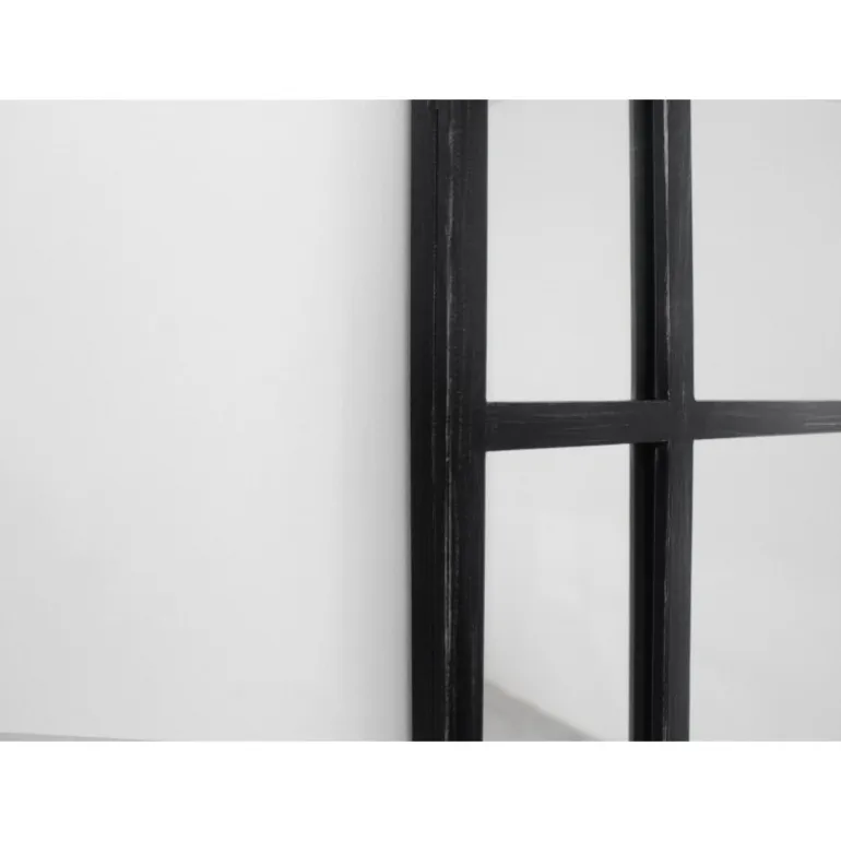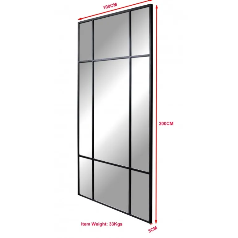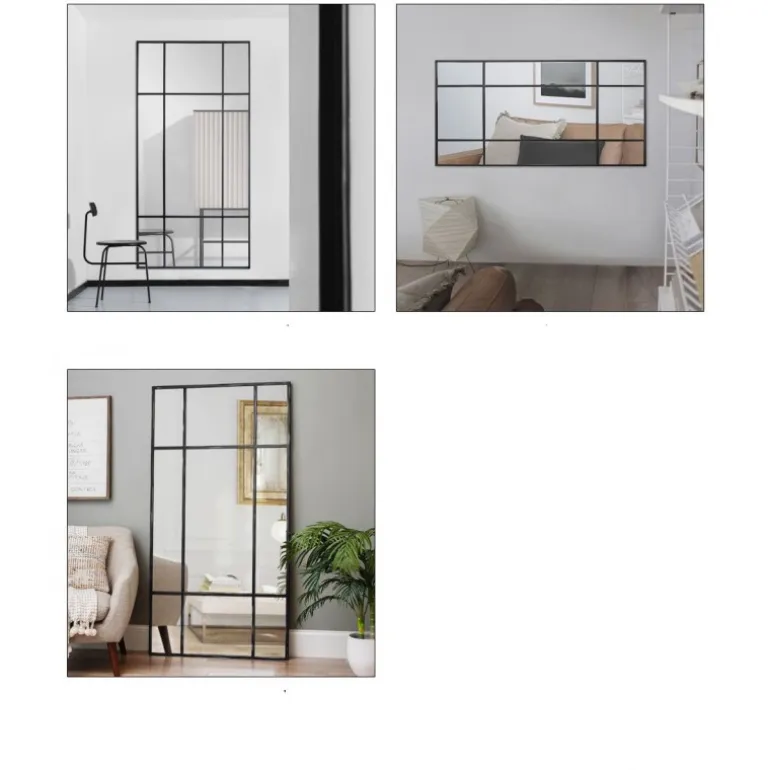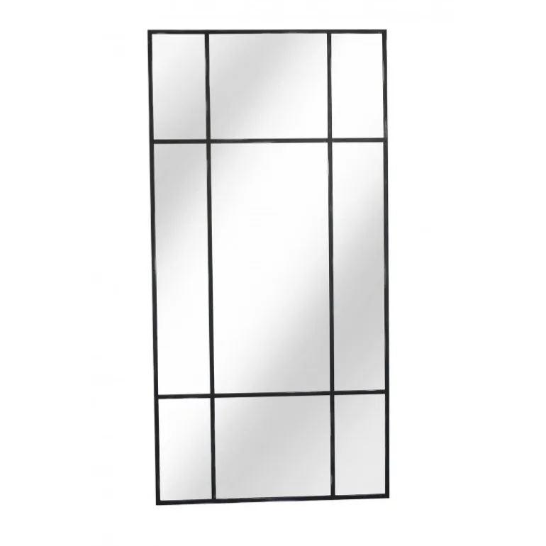Stort spejl til ophæng på væg med antiksort (silver brush) jernramme. Spejlet kan både stå på gulvet og hænges op vandret eller lodret.