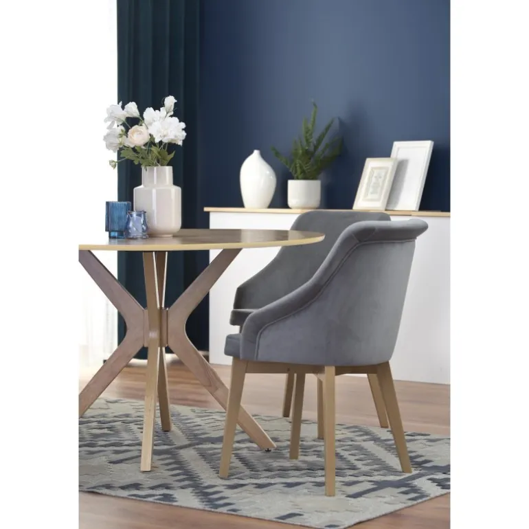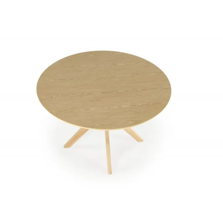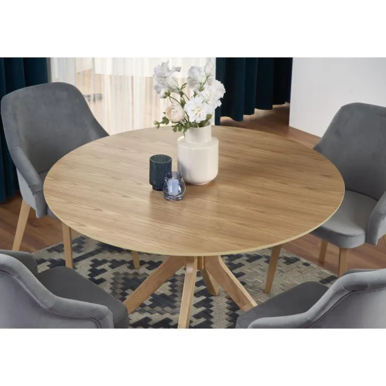 Oplev det smukke NICOLAS bord i naturlig eg, perfekt til din stue eller spisestue. Med en diameter på 120 cm og en højde på 77 cm tilbyder dette bord både stil og funktionalitet. Lavet af MDF med naturlig finer og massivt træ, sikrer det holdbarhed og elegance. Dette bord vil med sin naturlige egefarve passe perfekt ind i enhver indretning, og dets robuste konstruktion gør det ideelt til daglig brug.
