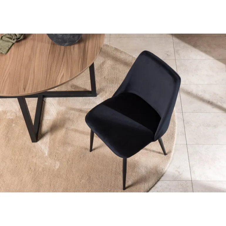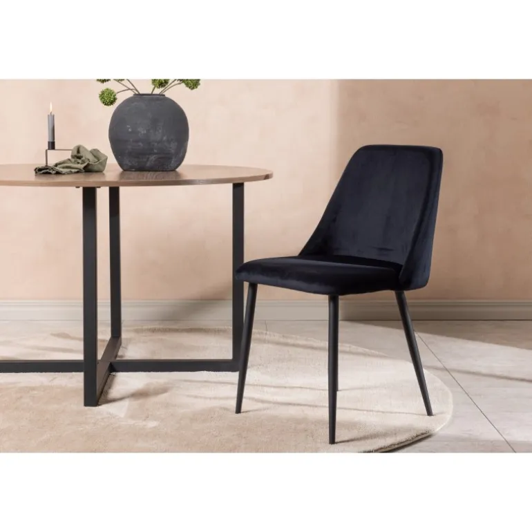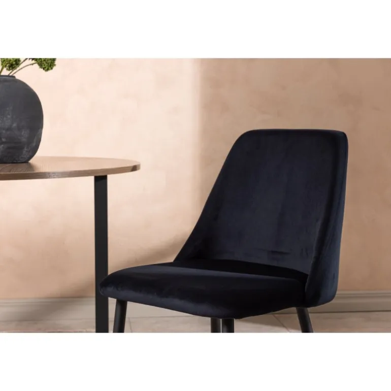 Spisebordsstolen fra NIGHT-serien er lige så komfortabel som den er stilfuld! Stolen har et fuldt polstret sæde i sort velourstof og stolben i matchende sort farve. Her får du en spisebordsstol, der skaber et luksuriøst skær i rummet og bidrager til en indbydende og modebevidst atmosfære. Det skal føles rart at sætte sig ned til et velsmagende måltid!