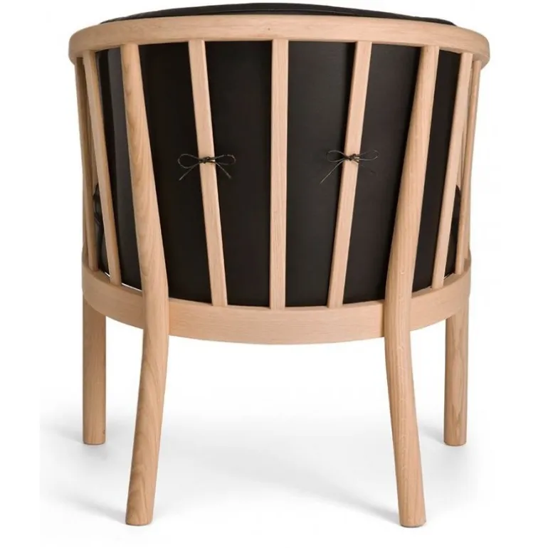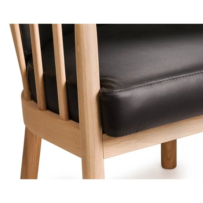 Klassisk og stilren armstol i massiv ubehandlet eg. Puderne er monteret med sort læder. Stolen er let og elegant og passer perfekt ind i ethvert hjem. Rigtig god siddekomfort.