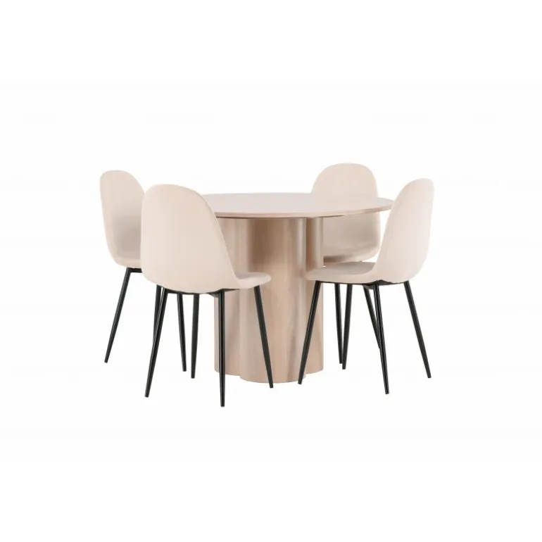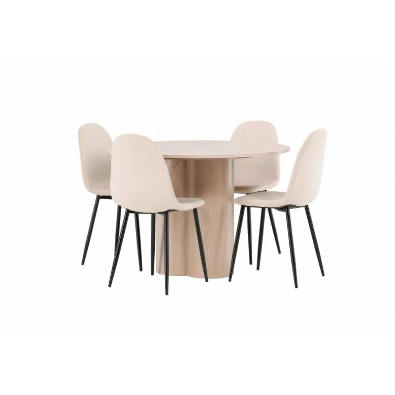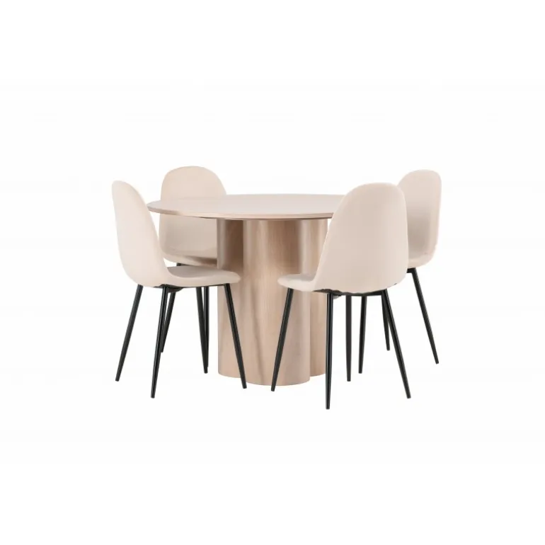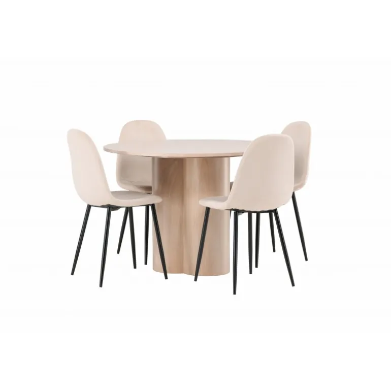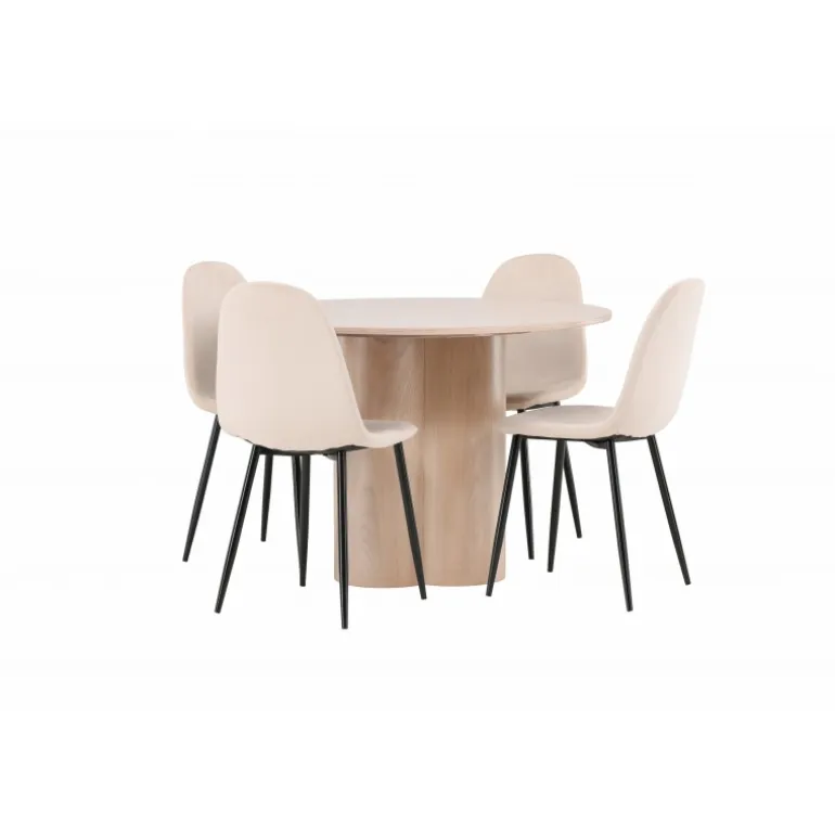 En moderne madgruppe, der inviterer til sociale øjeblikke med dine kære! Spisebordet Olivia har et smagfuldt skandinavisk design og en robust konstruktion. Bordet har et ensartet design i hvidmalet MDF med en tynd, rund bordplade og tre cylindriske ben, der er samlet under midten af bordet. Her sammen med 4 spisebordsstole fra Polar-serien. Stolens ryg er fuldt beklædt i polstret beige velourstof, og benene er i sort pulverlakeret metal. Skab en stilfuld blikfang i hjemmets hjerte – her ender ingen på kanten!