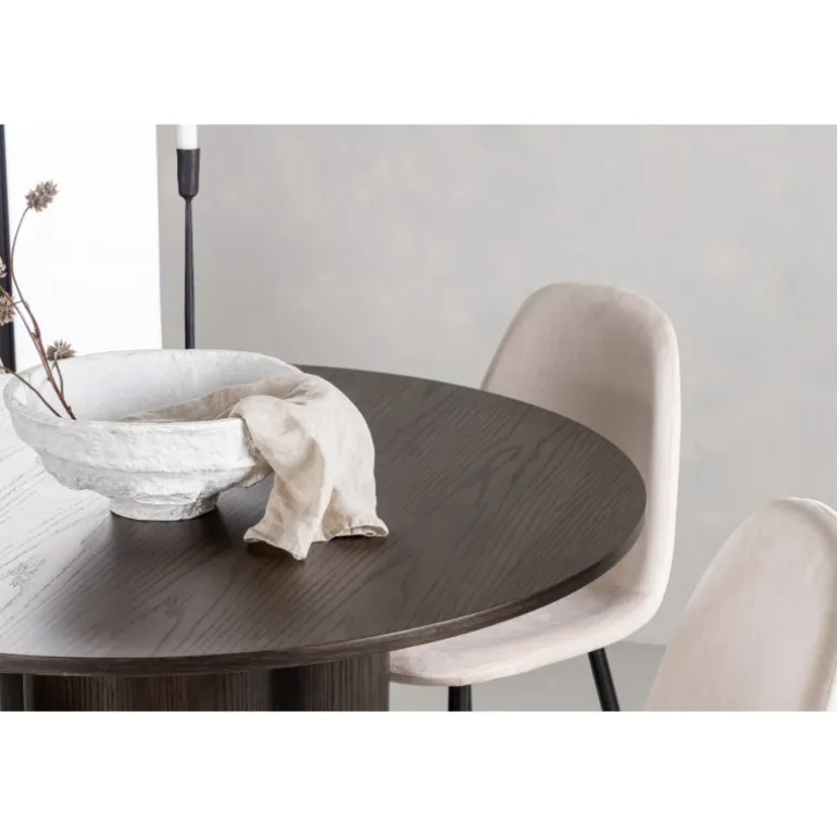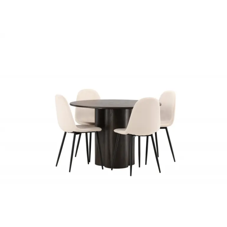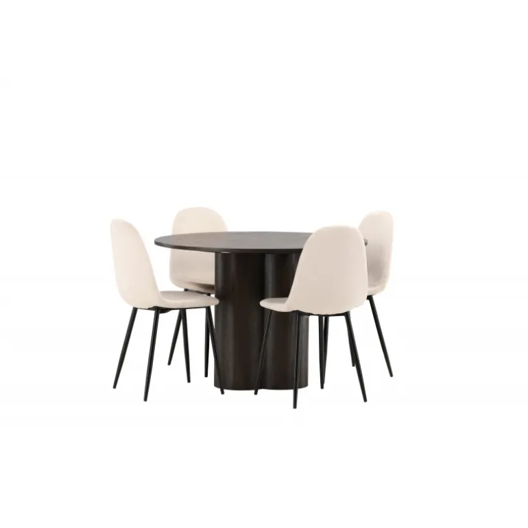 Olivia Rund Spisebordssæt udstråler luksus og bekvemmelighed! Spisebordet Olivia imponerer med sit skandinaviske og smagfulde design. Bordet kommer i en elegant mocca farve i MDF med en tynd, rund top og tre cylinderformede ben, der er samlet under bordets midte. Her kombineret med vores komfortable spisebordsstole fra Polar-serien. Stolen har et fuldt polstret design med en rundet ryg og sæde i beige fløjlstof med blød polstring og ben i sort pulverlakeret metal. Undgå at gå på kompromis mellem komfort og design!