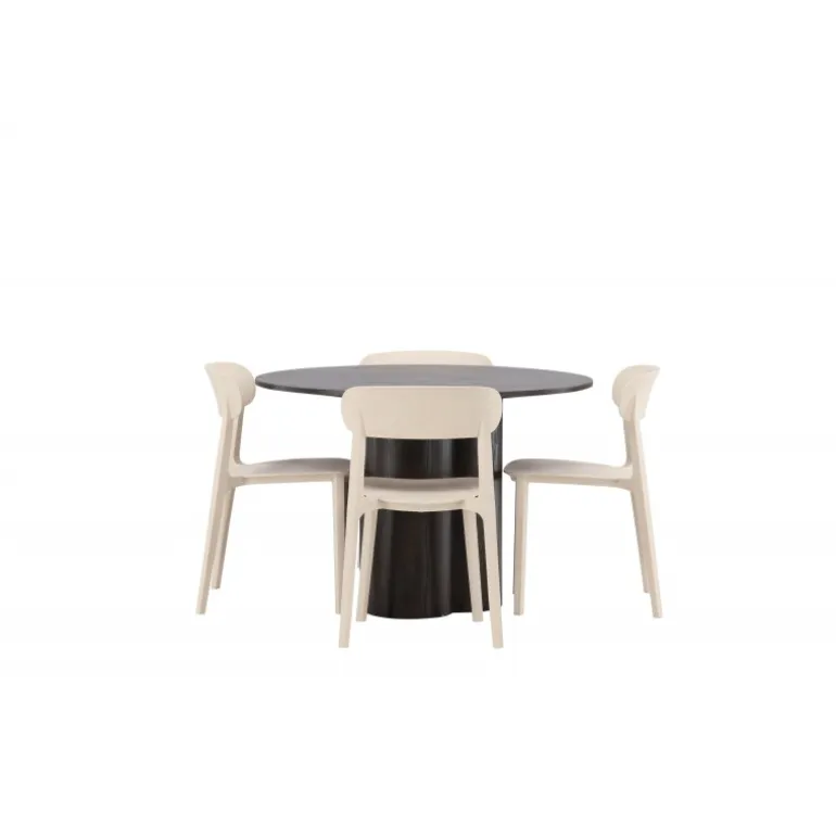 Skab et socialt og charmerende samlingspunkt for familien i dit hjem! Spisebordet Olivia imponerer med sit skandinaviske design. Bordet kommer i en smagfuld mocca farve i MDF med en tynd, rund bordplade og tre cylinderformede ben, der er samlet under midten af bordet. Her sammen med stole fra Åstol-serien i et klassisk design. Stolen er lavet af holdbar plastkomposit i en smagfuld træfarve. De lige nordiske former står tidens prøve. Her får du en indbydende Spisebordssæt!
