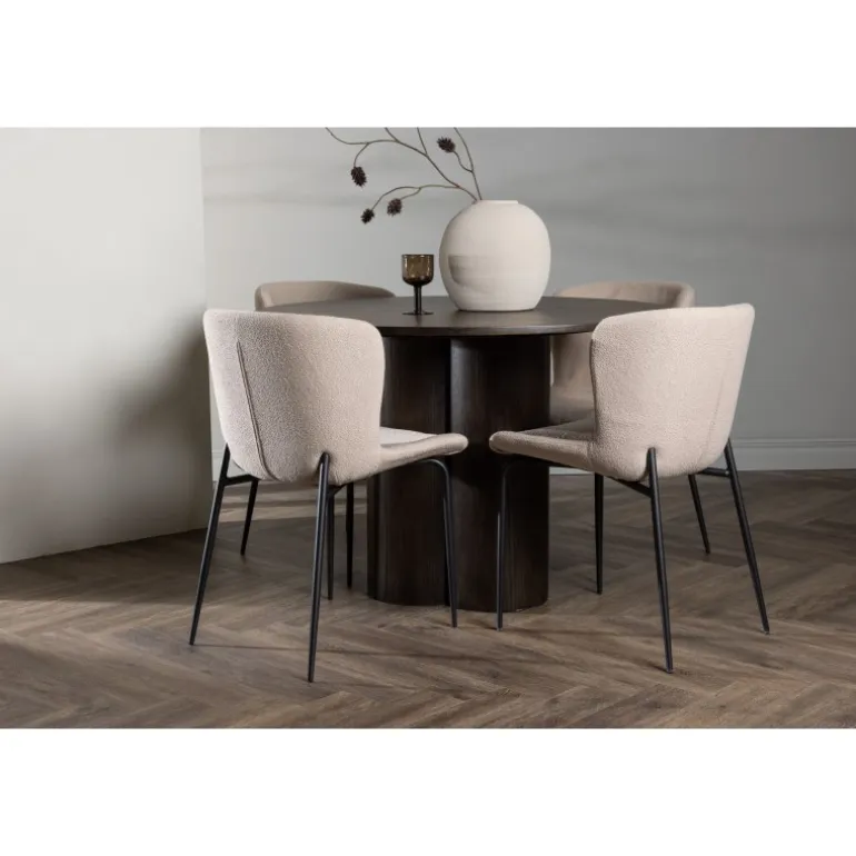 Her er der ingen, der ender på kanten! Den runde spisebord Olivia har et skandinavisk design i en moderne mocca farve. Bordet har en tynd MDF bordplade og tre cylinderformede ben, der er samlet under midten af bordet. Farven har en let dækkende effekt, som gør materialets mønster synligt. Her sammen med modebevidste spisestole fra Modesto serien. Stolen er fuldt polstret i beige pelsstof med stilfulde smalle ben i sort metal. Den let afrundede ryg og polstrede sædepude giver ekstra komfort og forlænger hyggelige måltider omkring spisebordet. Luksuriøst, stilfuldt og komfortabelt!