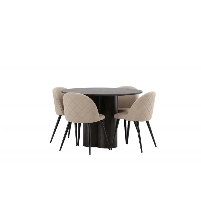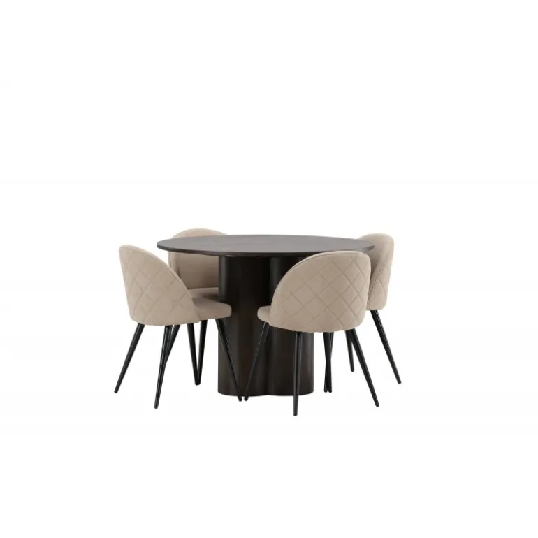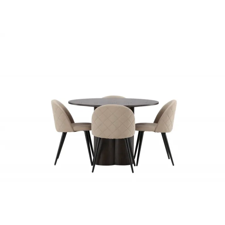 Skab en iøjnefaldende midtpunkt i dit hjem! Spisebordet Olivia imponerer med sit skandinaviske og smagfulde design. Bordet kommer i en elegant mocca farve i MDF med en tynd, rund top og tre cylinderformede ben, der er samlet under midten af bordet. Farven har en let dækning, som gør materialets mønster synligt. Her sammen med spisebordsstole fra Velvet Stitches serien. Denne spisebordsstol har et fuldt polstret design med en let rundet ryg og sæde i beige polyester stof og ben i sort pulverlakeret metal. Sid komfortabelt og behageligt!