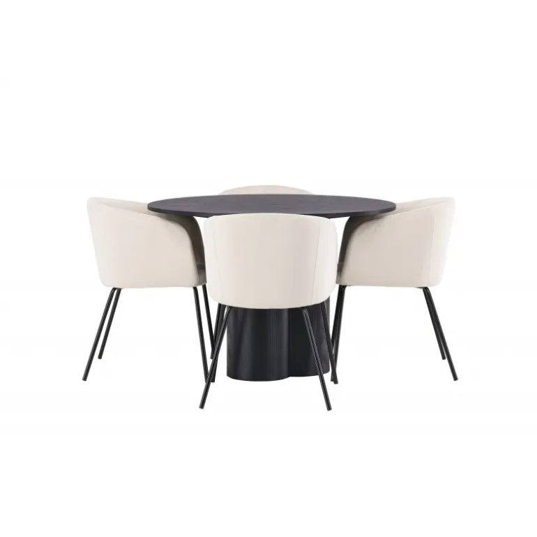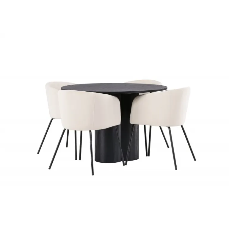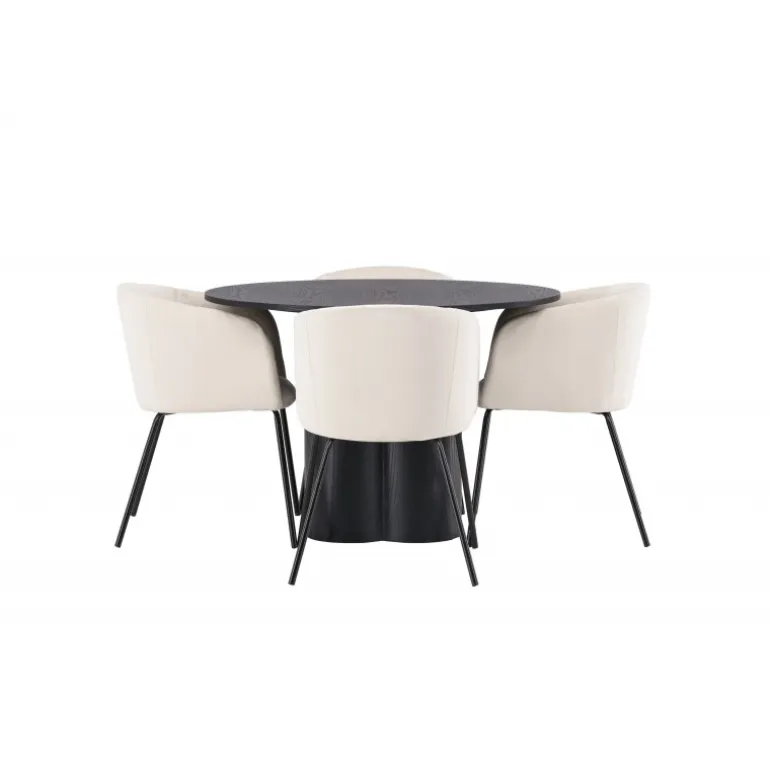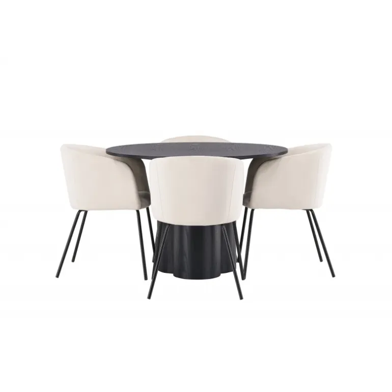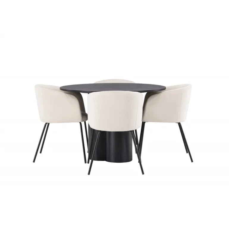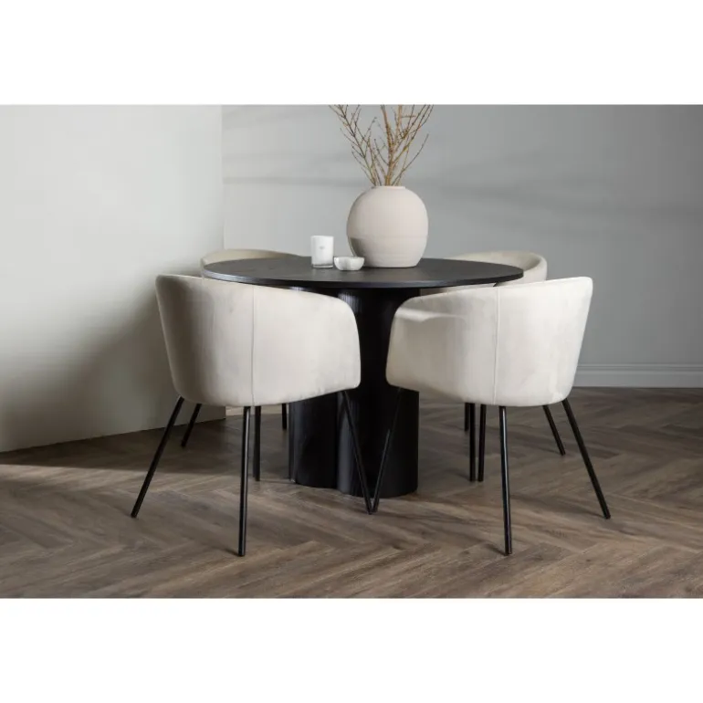 Stilfuld og smart Spisebordssæt med bløde former! Det runde spisebord Olivia imponerer med sit skandinaviske design og robuste konstruktion. Bordet har en konsekvent helhedsdesign i sort MDF med en tynd, rund bordplade og tre cylinderformede ben, der samles under midten af bordet. Her sammen med vores storslåede spisebordsstole Berit. Stolen har et fuldt polstret design med let afrundet ryg og sæde i velourstof og smalle ben i sort jern. Lige så moderne som den er behagelig! Bordets dimensioner: 110 cm.