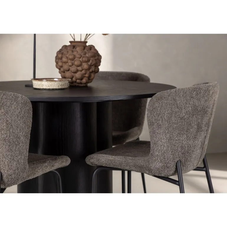 Skab en indbydende atmosfære i hjertet af dit hjem med denne stilfulde spisestuegruppe! Stolene er fra Modesto-serien og har polstring i grå, blød bouclé-stof og elegante minimalistiske ben i sort metal. Den let afrundede ryg og polstrede sædepude giver ekstra komfort og forlænger de hyggelige måltider omkring spisebordet. Bordet har et helhedspræget design i sort MDF med en tynd, rund top og tre cylinderformede ben, der er samlet under midten af bordet. Farven har en let dækning på det finérerede bræt, hvilket gør materialets mønster synligt og giver bevægelse til møblet. Det skal føles godt at sætte sig ned til et hyggeligt måltid!