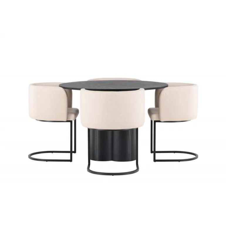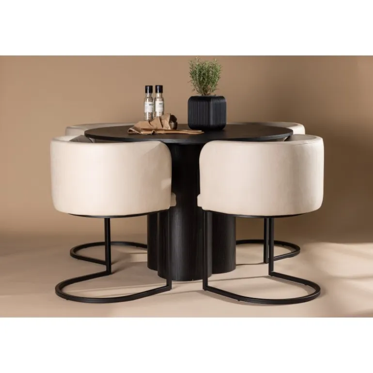 Indret luksuriøst og storslået! Det runde spisebord Olivia har et holistisk design i sort MDF med en tynd, rund bordplade og tre cylinderformede ben, der samles under bordets centrum. Farven har en let dækning på det finérbelagte bræt, hvilket gør materialets mønster synligt. Her sammen med vores elegante spisebordsstole fra Simrishamn-serien. Stolen har en fuldt polstret sæde med en afrundet ryglæn i beige TC-stof og dekorative, minimalistiske ben i sort stål. Sid komfortabelt og nyd samvær med dine kære! Bordets dimensioner: 110 cm.