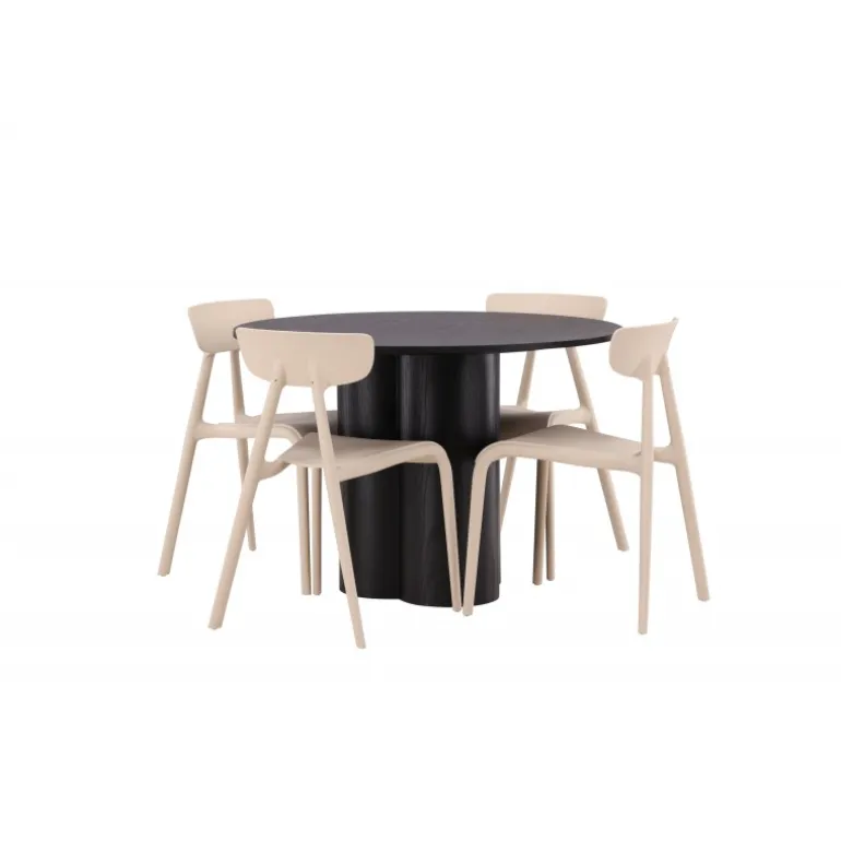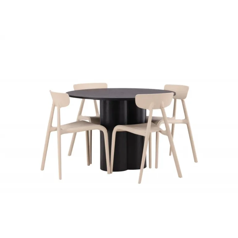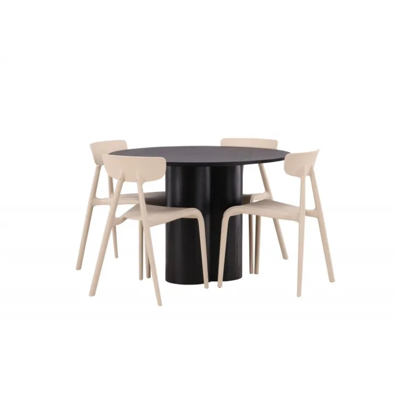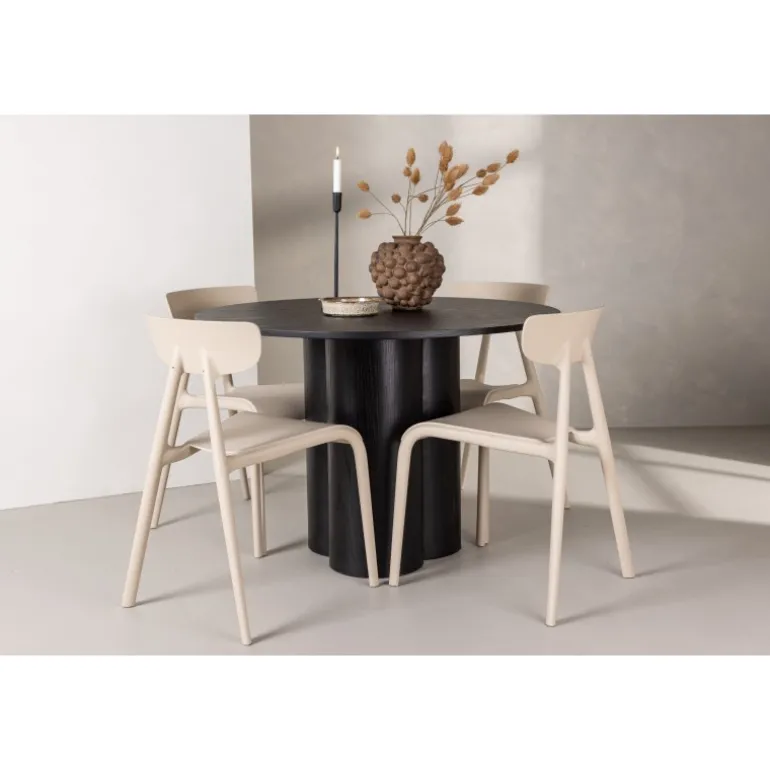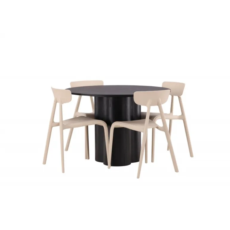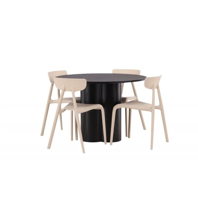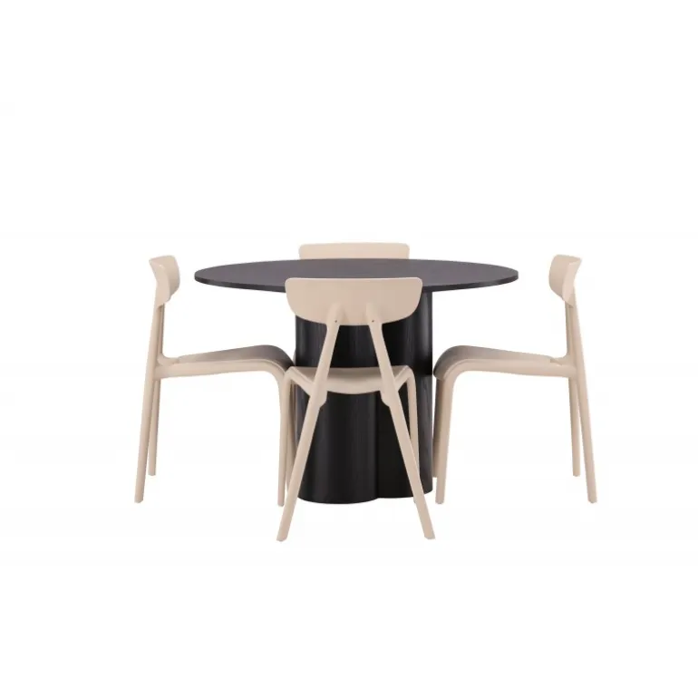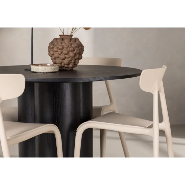 Nyd hyggelige måltider omkring vores populære Olivia spisebord. Bordet har et gennemført holistisk design i sort MDF med en tynd, rund bordplade og tre cylinderformede ben, der samles under midten af bordet. Farven har en let dækning på det finérbelagte bræt, hvilket gør materialets mønster synligt og giver møblet bevægelse. Her sammen med moderne spisebordsstole fra Ursholmen serien. Lavet af holdbar plast i en smuk beige farve, der er nem at matche med andre møbler. Undgå at gå på kompromis mellem stil og funktionalitet!