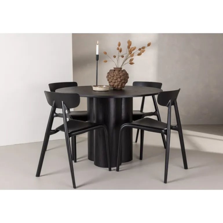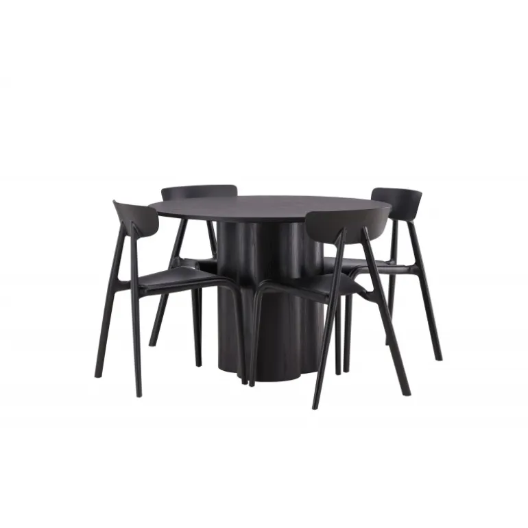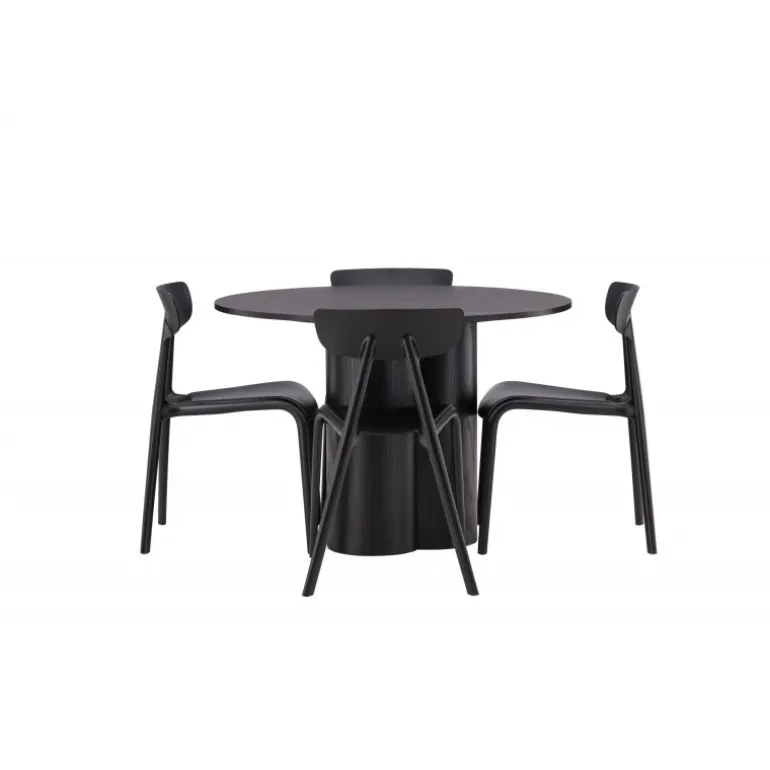 Skab en hyggelig atmosfære i din stue med en moderne spisestuegruppe! Spisebordet Olivia imponerer med sit skandinaviske design og smagfulde udseende. Bordet er designet i en sodsort farve. Den runde bordplade er lavet af MDF, og stellet består af tre cylinderformede ben, der samles under midten af bordet. Dette sæt inkluderer også dejlige spisebordsstole fra Ursholmen-serien. De er fremstillet af holdbar plastik i en slank sort farve, der er let at matche med andre møbler. Stolen har en minimalistisk ryg, en lidt dybere sæde og let flarede ben i et skandinavisk design. Undgå at gå på kompromis mellem stil og funktionalitet!