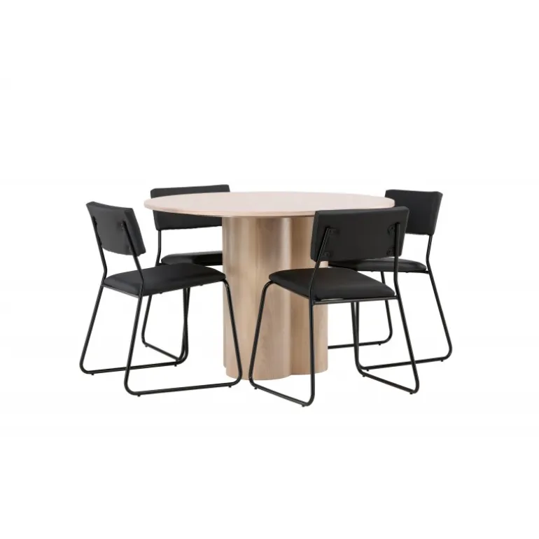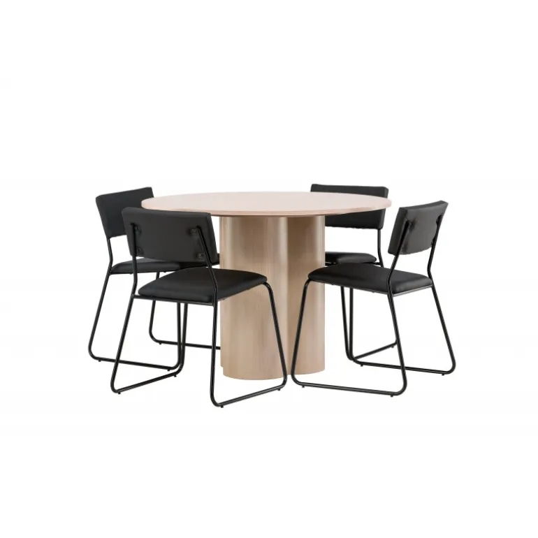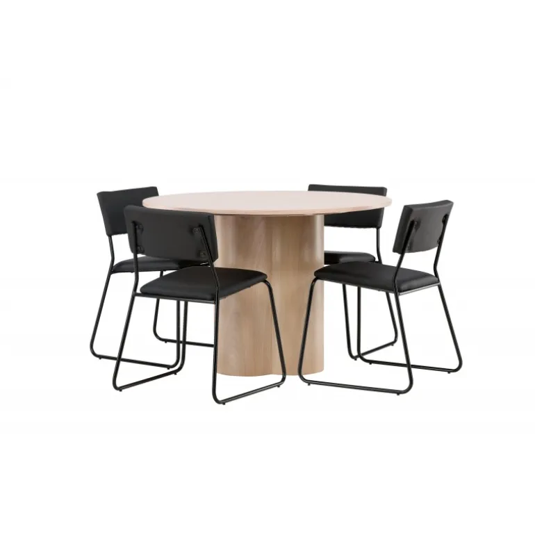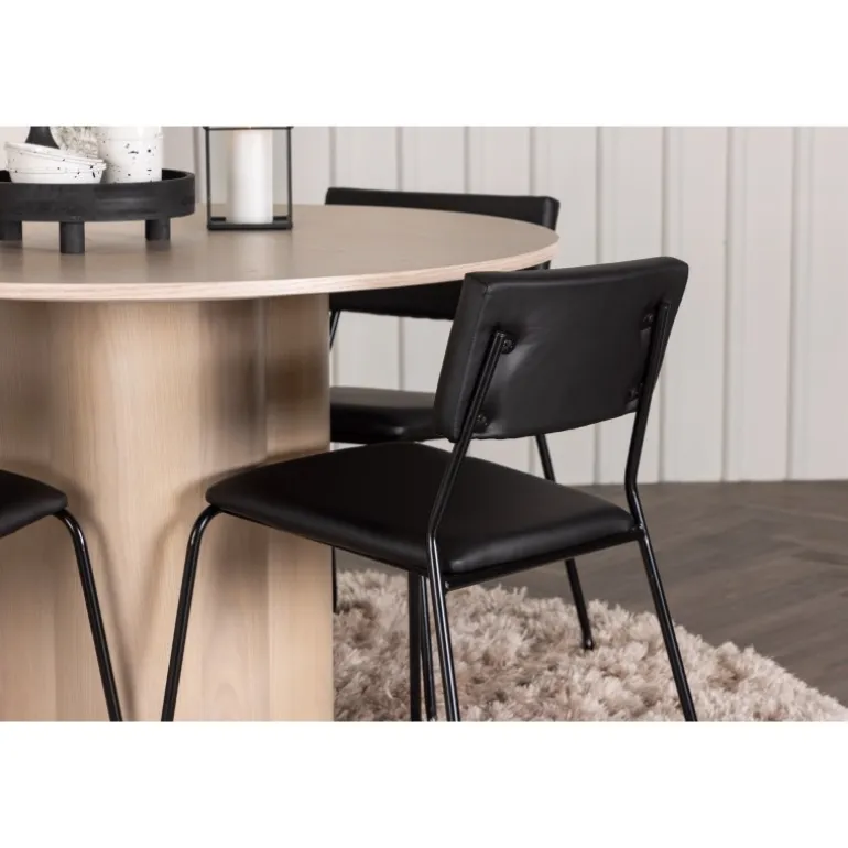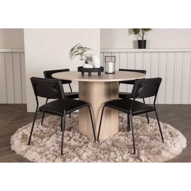 Den perfekte kombination af minimalisme og robust design! Spisebordet fra Olivia-serien har et konsekvent overordnet design i hvidt pudset MDF med en tynd, rund topplade og tre cylindriske ben, der er samlet under midten af bordet. Farven har en let dækning på den finérbelagte skive, hvilket gør materialet synligt og giver liv og bevægelse til bordet. Her sammen med 4 moderne spisebordsstole fra Kenth-serien. Stolen har ryglæn og sæde i sort polyurethanmembran og polyester samt dekorativt smalle stoleben i jern. Skab et luksuriøst midtpunkt i hjertet af hjemmet!