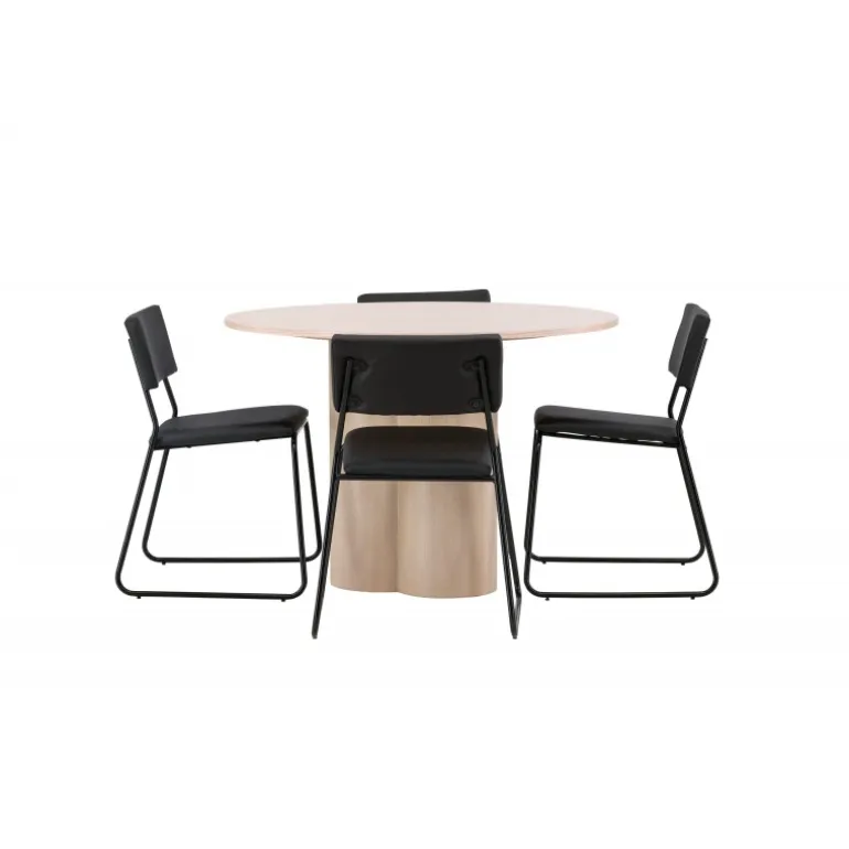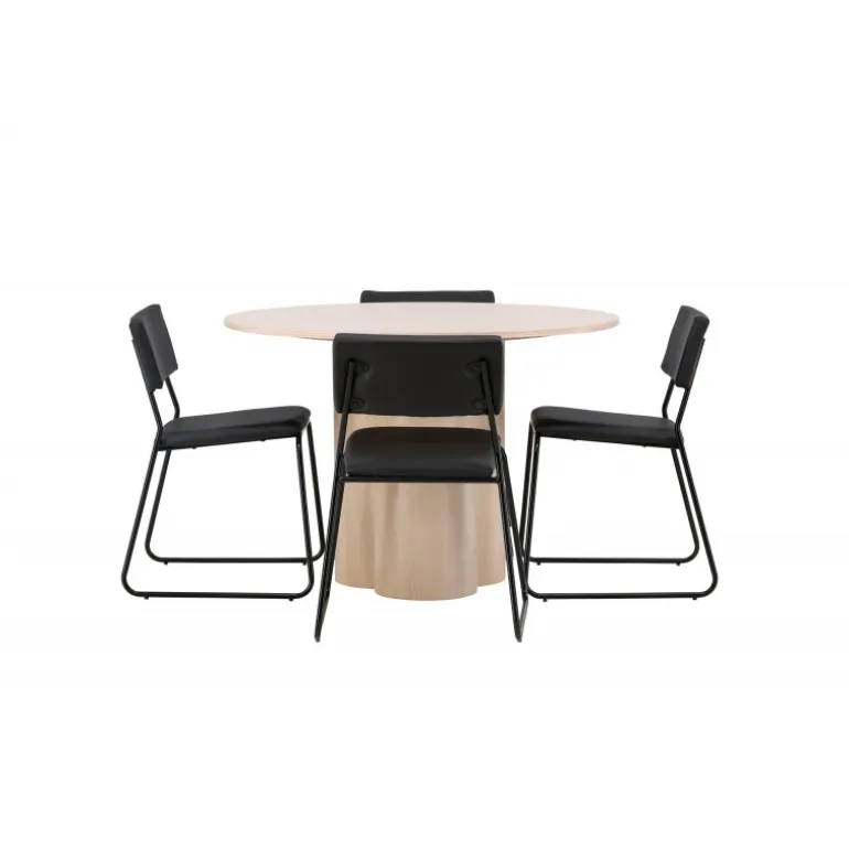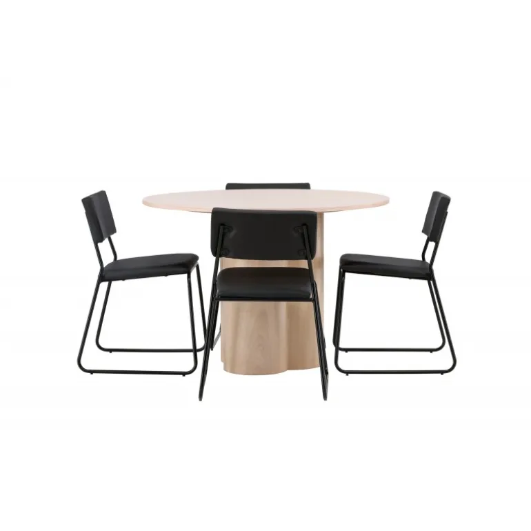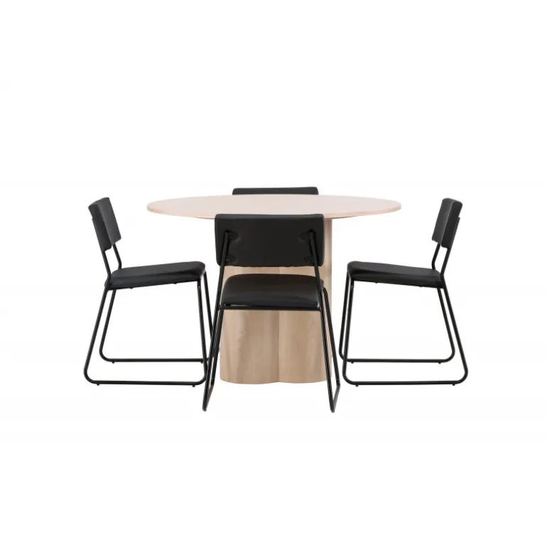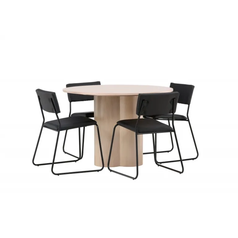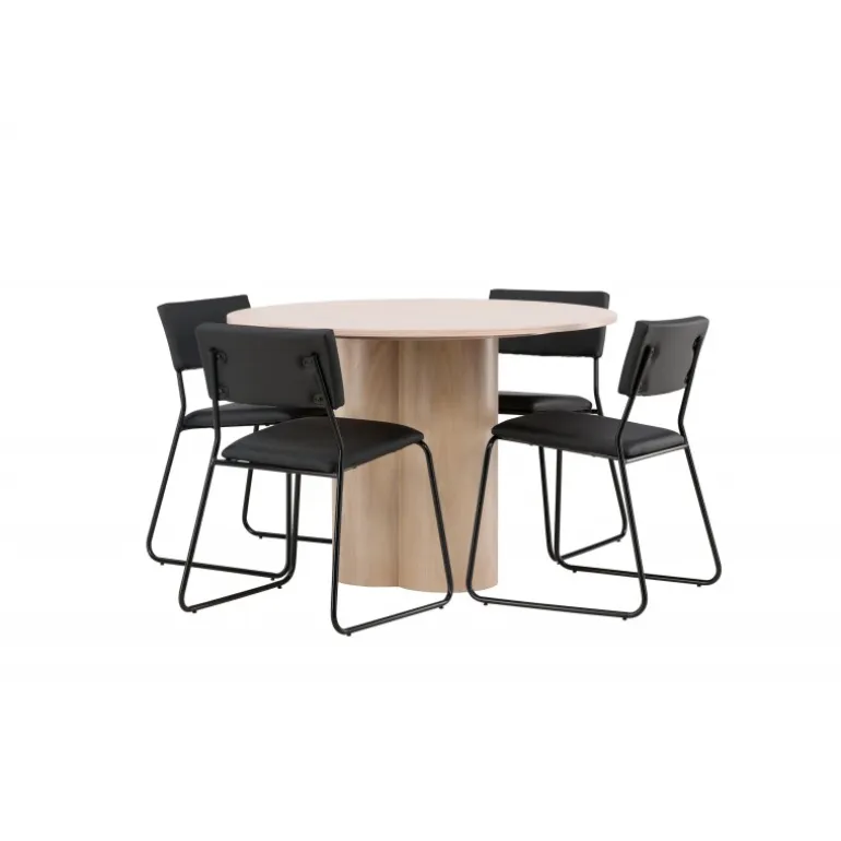 Den perfekte kombination af minimalisme og robust design! Spisebordet fra Olivia-serien har et konsekvent overordnet design i hvidt pudset MDF med en tynd, rund topplade og tre cylindriske ben, der er samlet under midten af bordet. Farven har en let dækning på den finérbelagte skive, hvilket gør materialet synligt og giver liv og bevægelse til bordet. Her sammen med 4 moderne spisebordsstole fra Kenth-serien. Stolen har ryglæn og sæde i sort polyurethanmembran og polyester samt dekorativt smalle stoleben i jern. Skab et luksuriøst midtpunkt i hjertet af hjemmet!