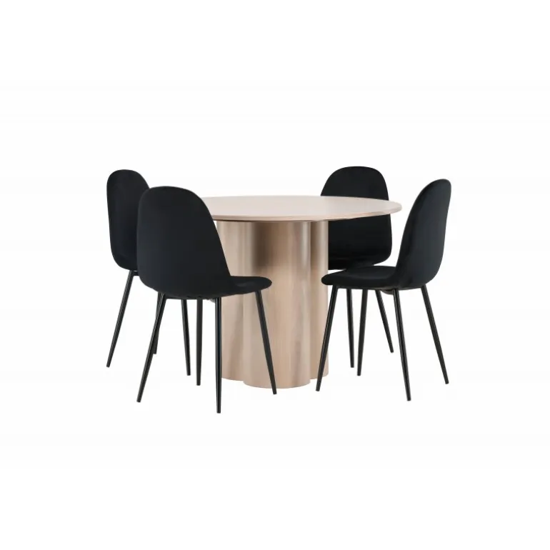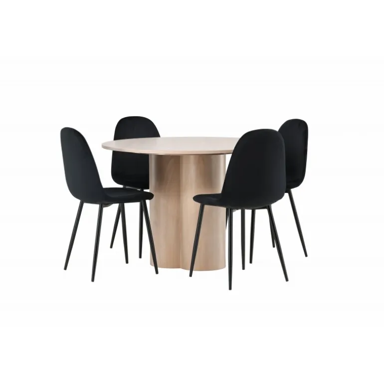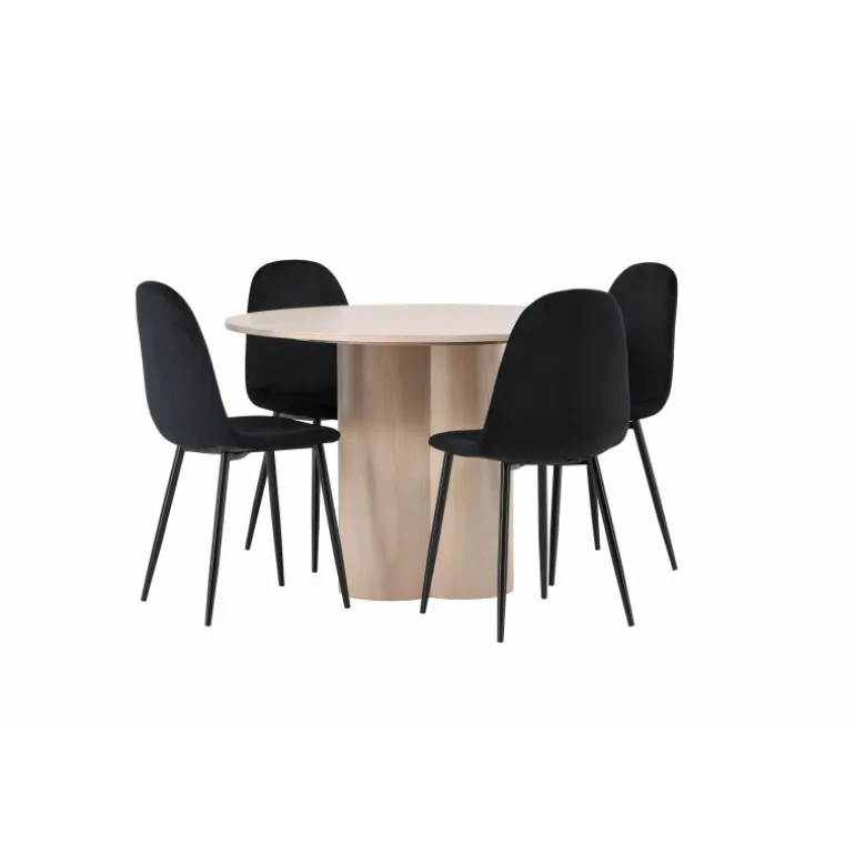Inviter dine kære til hyggelige stunder med Olivia Rund Spisebordssæt! Dette stilfulde spisebord har et elegant skandinavisk design og en robust konstruktion. Bordet er lavet af hvidmalet MDF med en tynd, rund bordplade og tre cylindriske ben, der samles under midten af bordet. Sættet inkluderer også 4 spisebordsstole fra Polar-serien. Stolene er betrukket med sort fløjl og har ben i sort pulverlakeret metal. Skab et elegant blikfang i hjemmets hjerte – her sidder ingen på kanten!