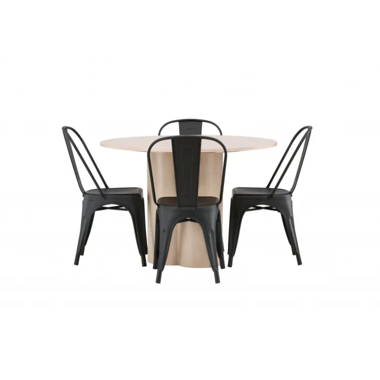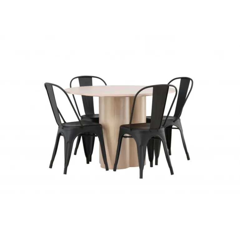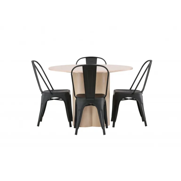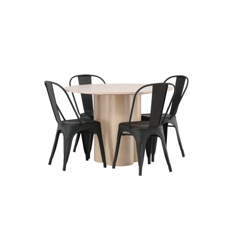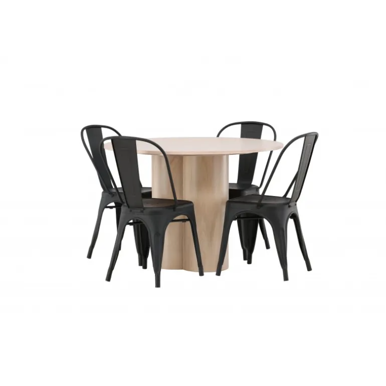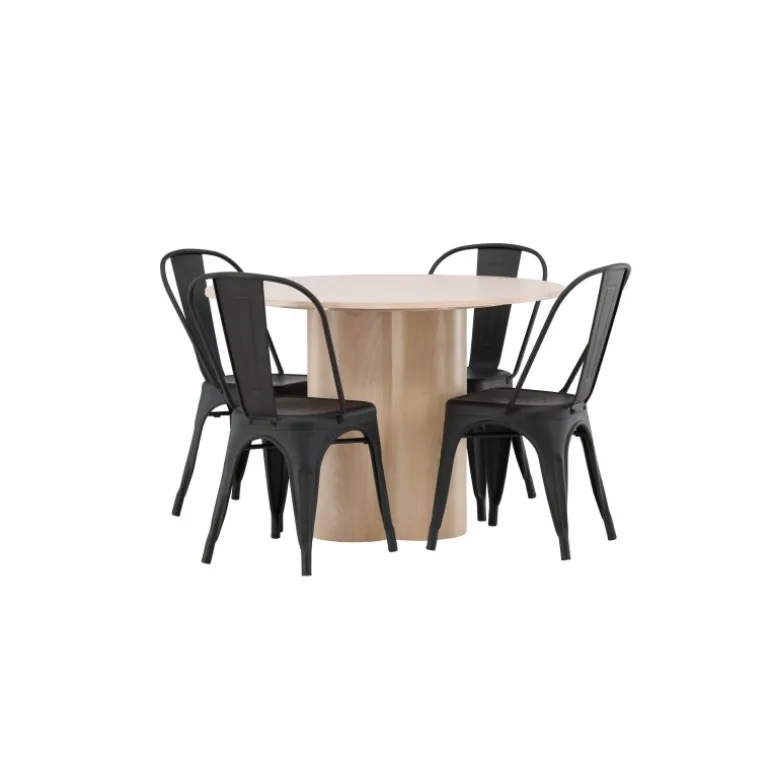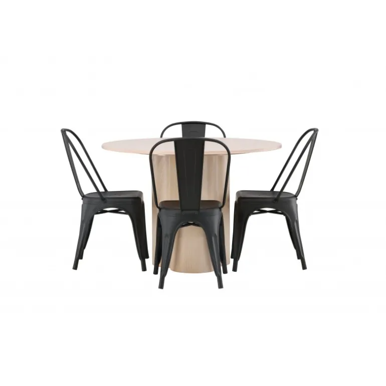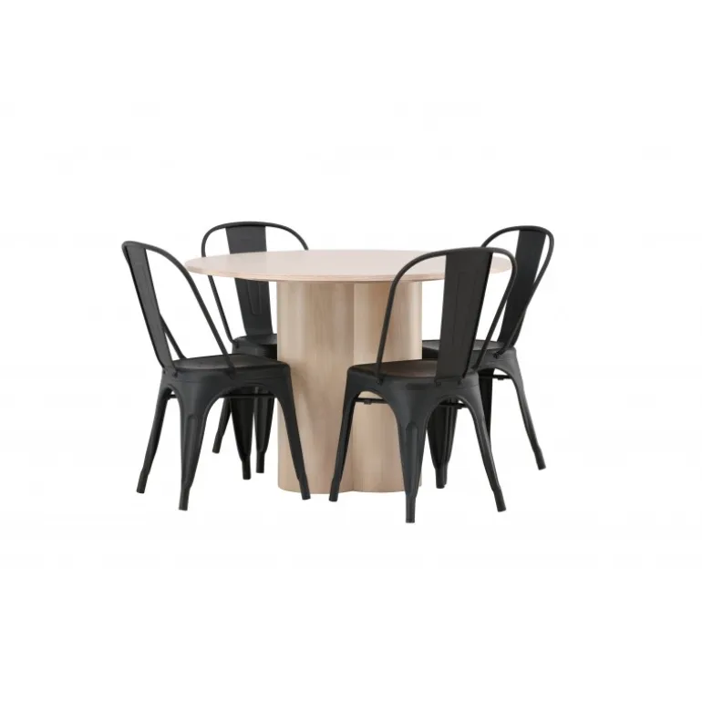 En pompøs Spisebordssæt der passer perfekt ind i det moderne hjem! Spisebordet Olivia har et smagfuldt skandinavisk design og en robust konstruktion. Bordet har et ensartet design i hvidpudset MDF med en tynd, rund bordplade og tre cylindriske ben, der er samlet under midten af bordet. Her sammen med 4 spisebordsstole fra Tempe-serien. Stolen har let udadgående ben, der møder sædet og ryglænet i et stilfuldt design, konsekvent lavet af sort metal. Inviter til mange sociale stunder fremover – ingen ender her!