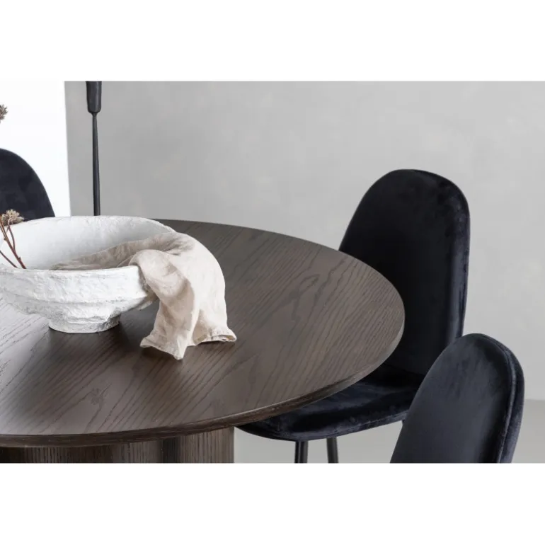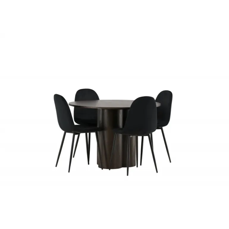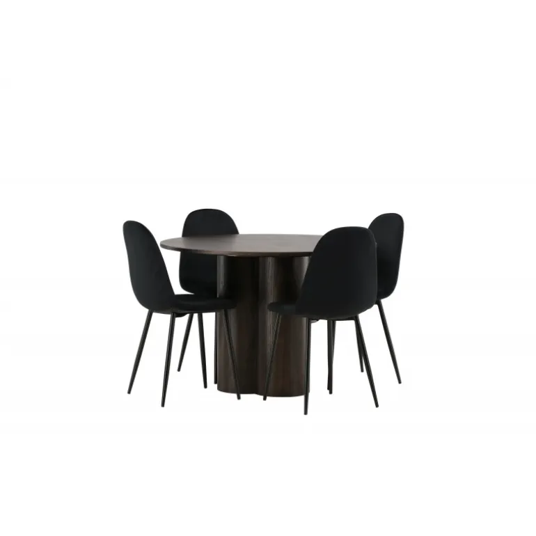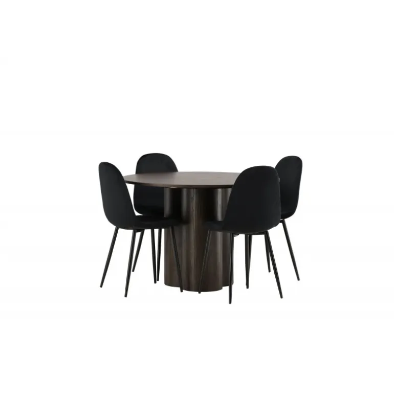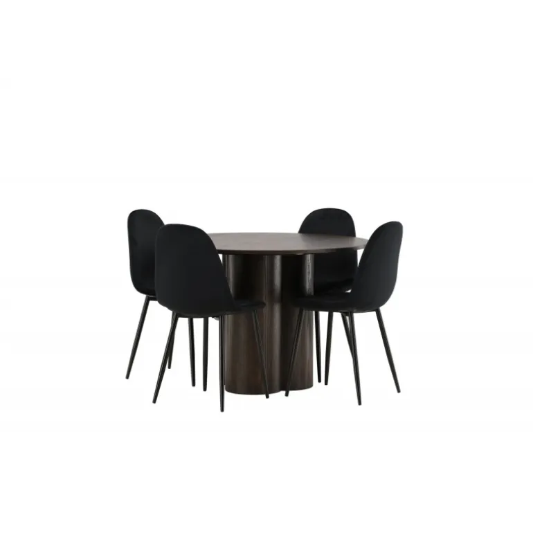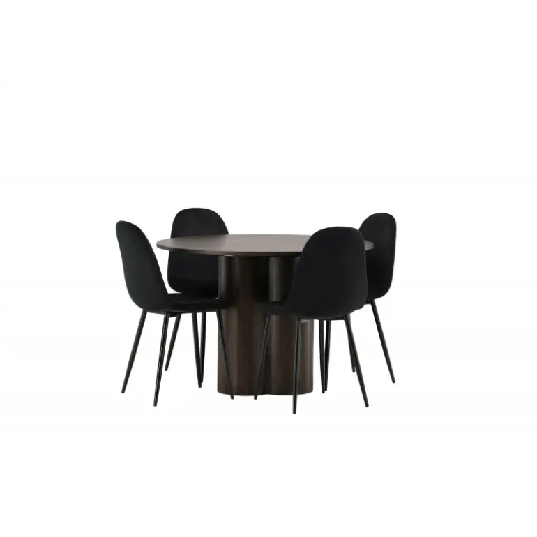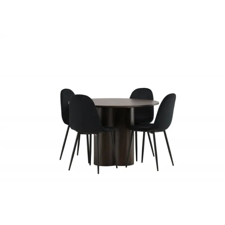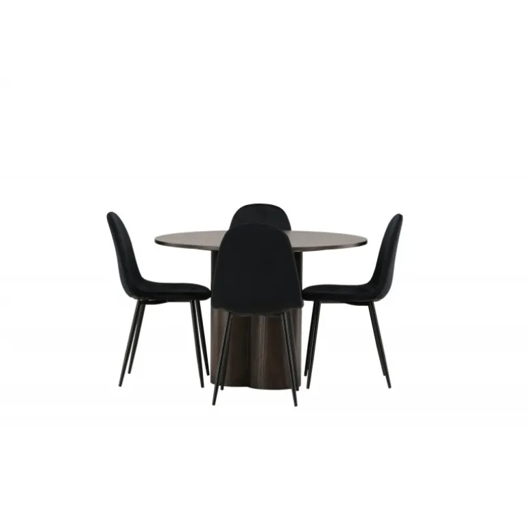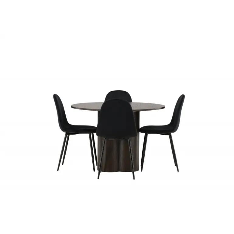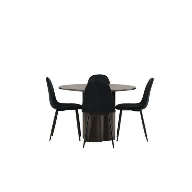 Undgå at gå på kompromis mellem stil og komfort! Spisebordet Olivia imponerer med sit skandinaviske og smagfulde design. Bordet kommer i en elegant mocca farve i MDF med en tynd, rund top og tre cylinderformede ben, der er samlet under midten af bordet. Her i perfekt kombination med stole fra Polar-serien. Stolen har et fuldt polstret design med en afrundet ryg og sæde i sort velourstof med blød polstring og ben i sort pulverlakeret metal. Nyd behagelige måltider med denne stilfulde og komfortable Spisebordssæte!
