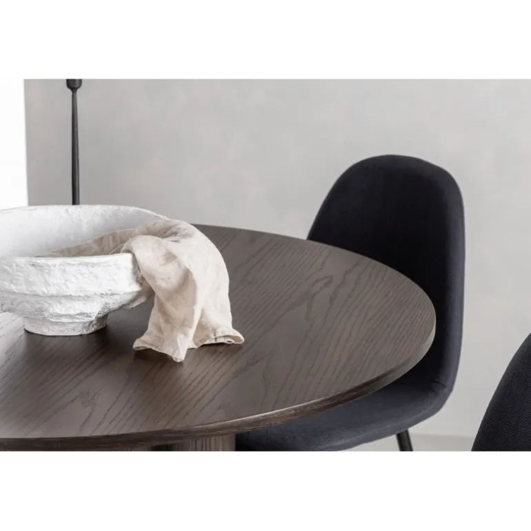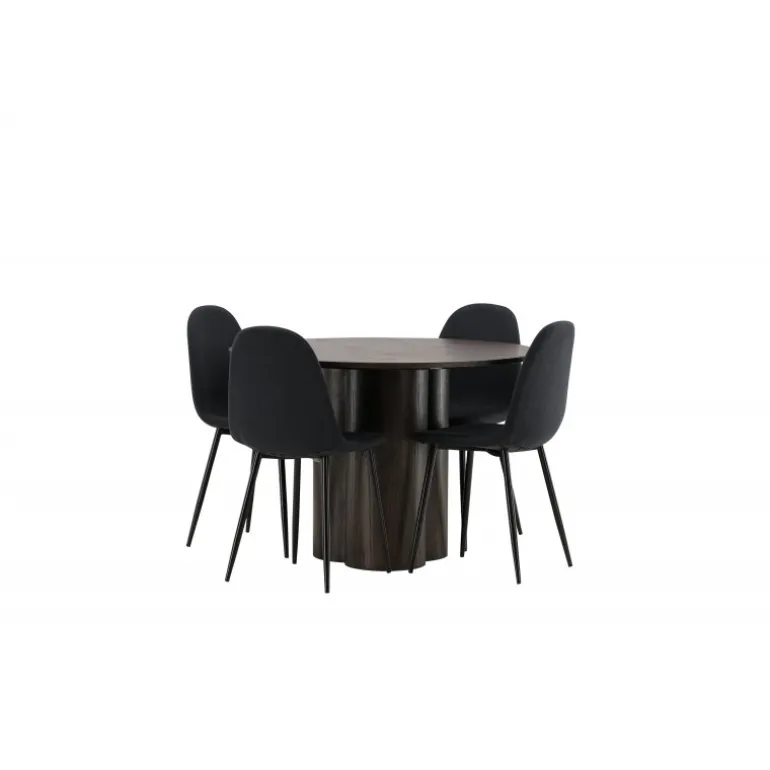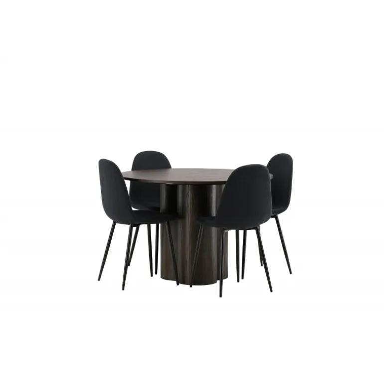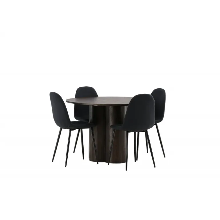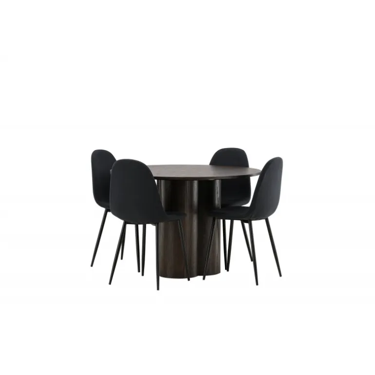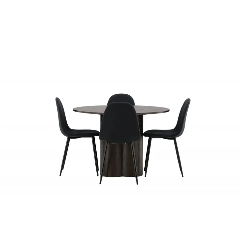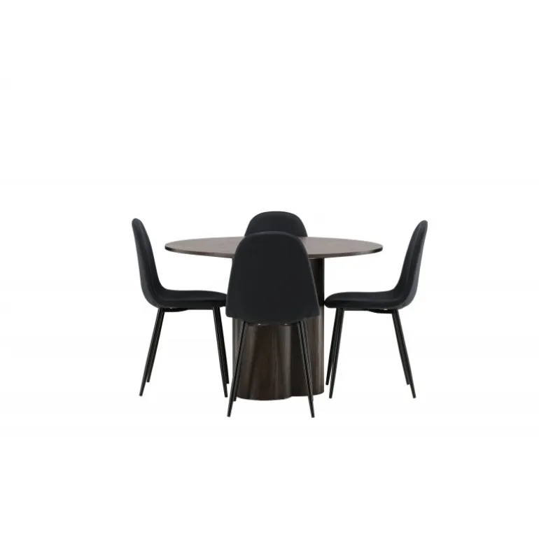 Moderne, stilfuld og holdbar! Spisebordet Olivia imponerer med sit skandinaviske og smagfulde design. Bordet kommer i en smagfuld mocca-farve i MDF med en tynd, rund top og tre cylinderformede ben, der er samlet under midten af bordet. Her sammen med vores komfortable spisebordsstole fra Polar-serien. Stolen har et fuldt polstret design med en rund ryg og sæde i sort polyesterstof med blød polstring og ben i sort pulverlakeret metal. Undgå at gå på kompromis mellem komfort og design!