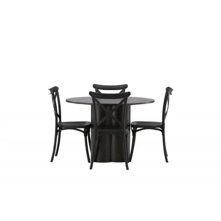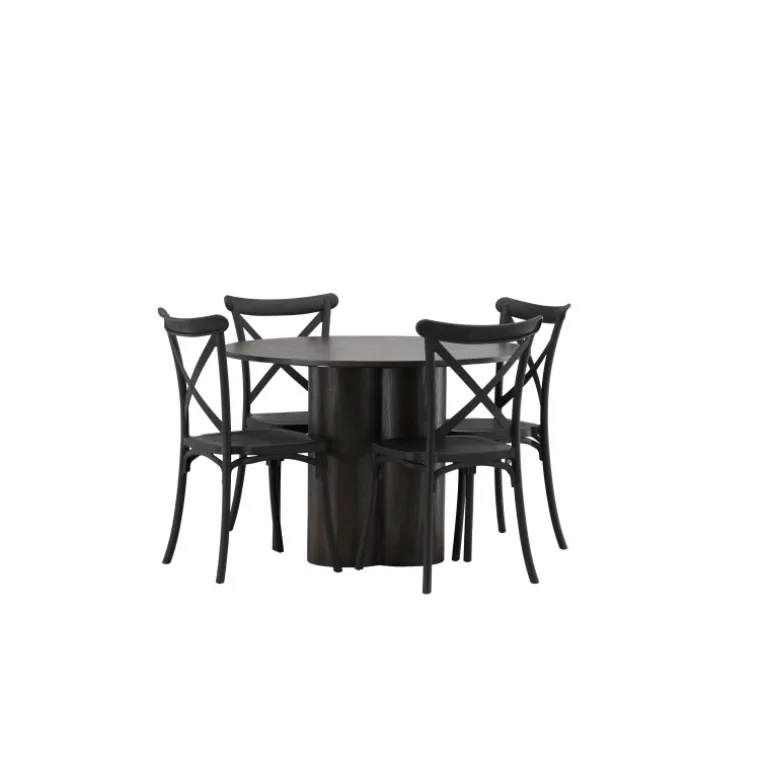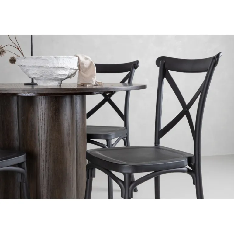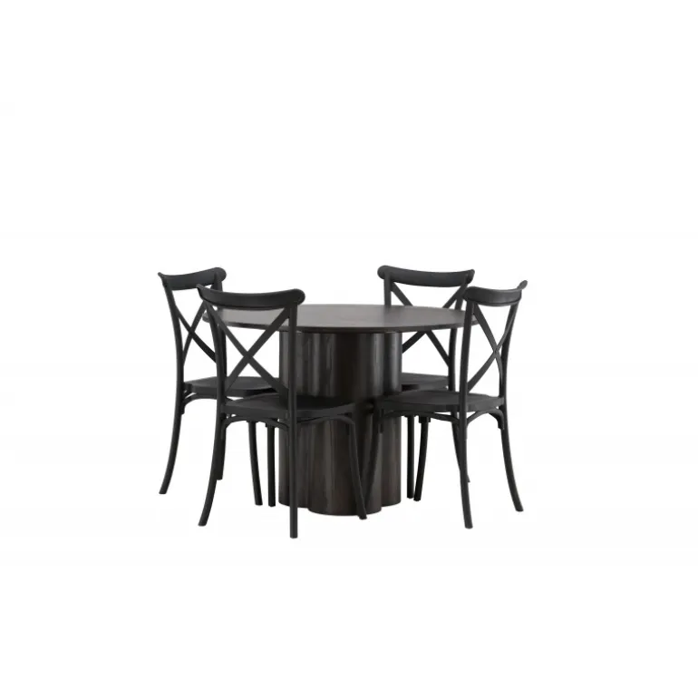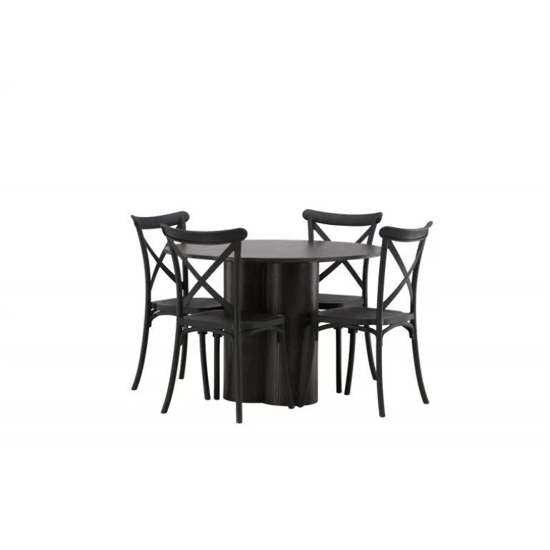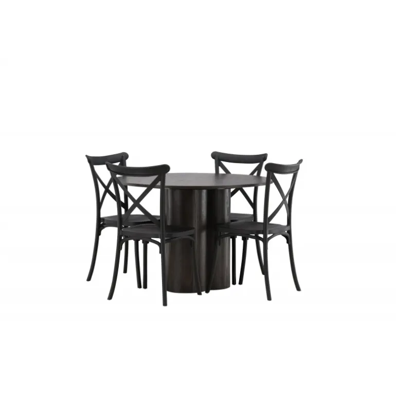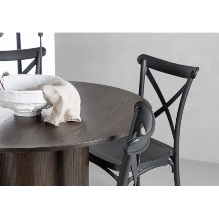 En spisestuegruppe, der kombinerer klassisk design og moderne former! Spisebordet Olivia imponerer med sit skandinaviske design og smagfulde udseende. Bordet kommer i en elegant mocca farve i MDF med en tynd, rund top og tre cylinderformede ben, der er samlet under midten af bordet. Her sammen med spiseborde fra Crosett-serien. Stolene har et nostalgisk design med krydset ryg og lige linjer, konsekvent lavet af sort plast. Her får du en stilfuld spisestuegruppe til at dekorere dit hjem med!