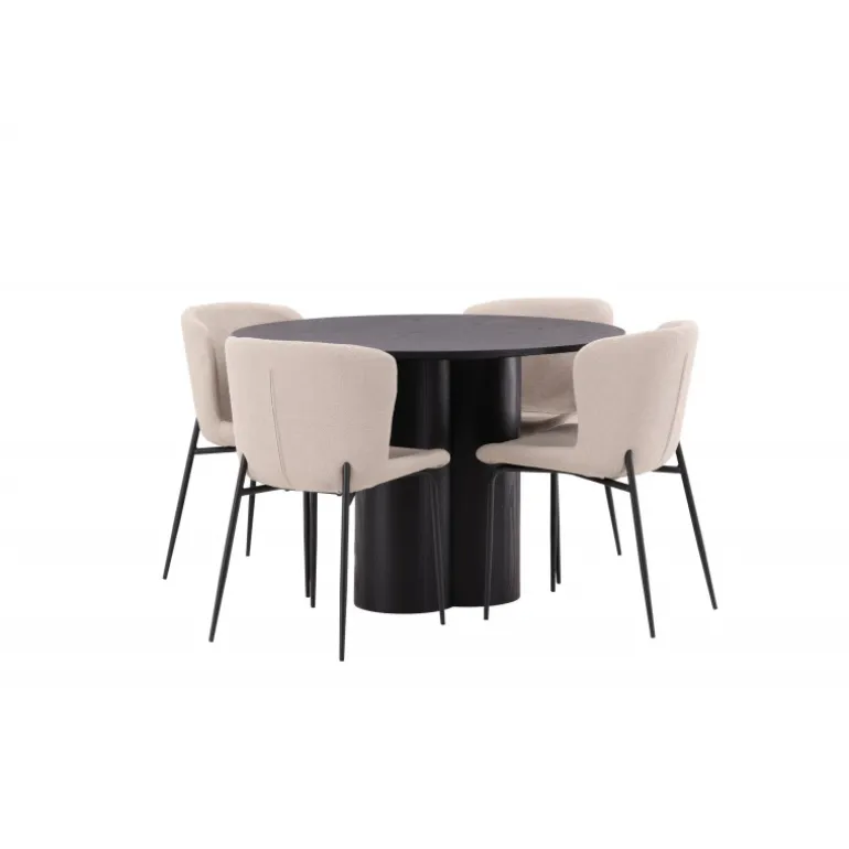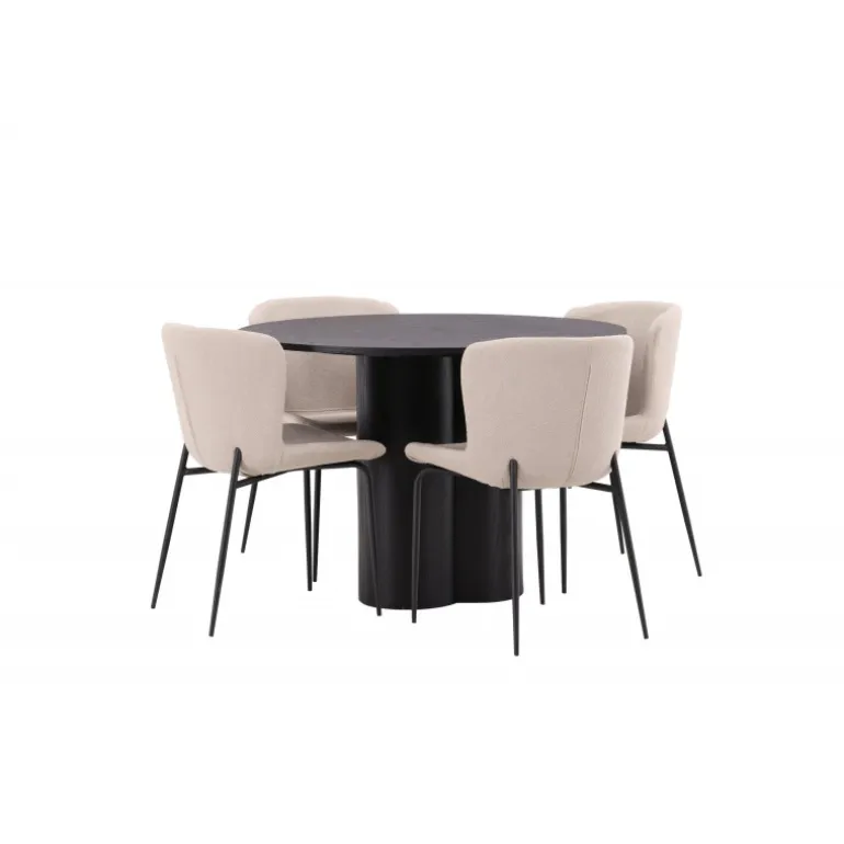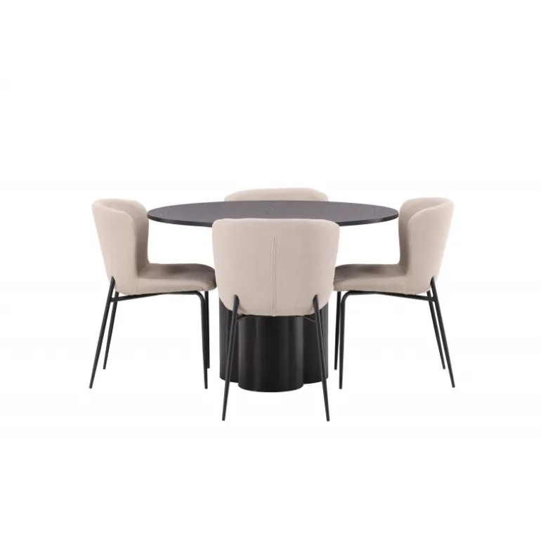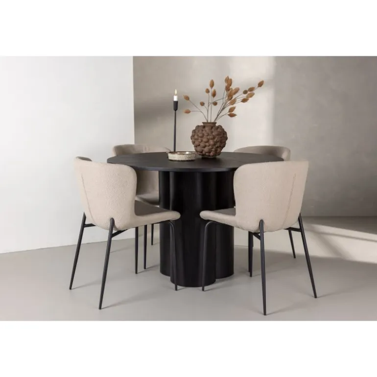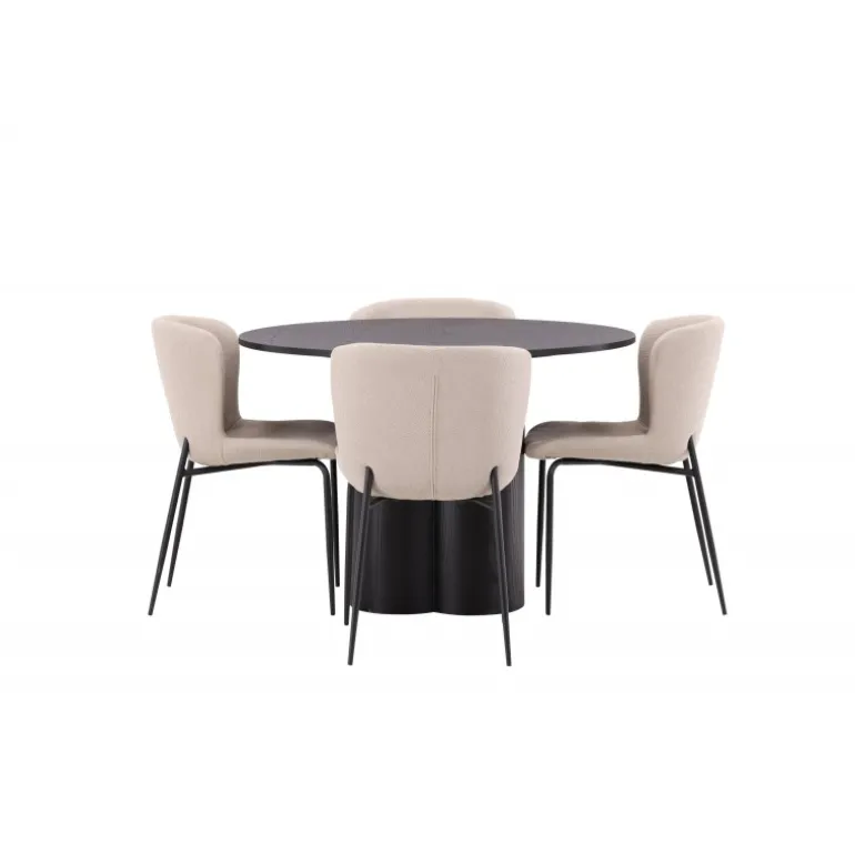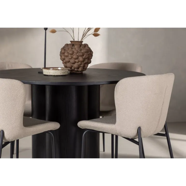 Skab en indbydende atmosfære i dit hjems hjerte med denne stilfulde Spisebordssæt! Stolene er fra Modesto-serien og har en polstring i beige, fluffy bouclé-stof og minimalistiske ben i sort metal. Den let afrundede ryg og den polstrede sædepude giver ekstra komfort. Her i en fantastisk kombination med spisebordet Olivia. Bordet har et holistisk design i sort MDF med en tynd, rund top og tre cylinderformede ben, der er samlet under midten af bordet. Farven har en let dække på den finerede plade, hvilket gør materialets mønster synligt. Det skal føles godt at sætte sig ned til et dejligt måltid!