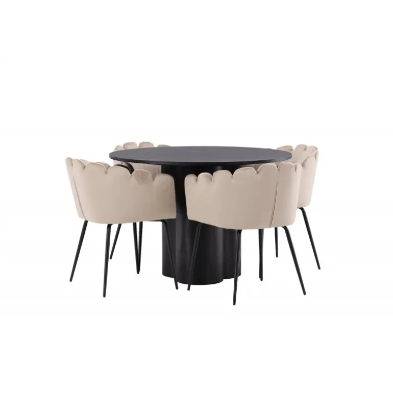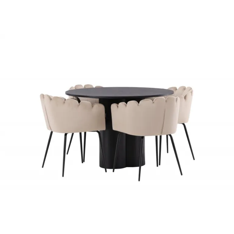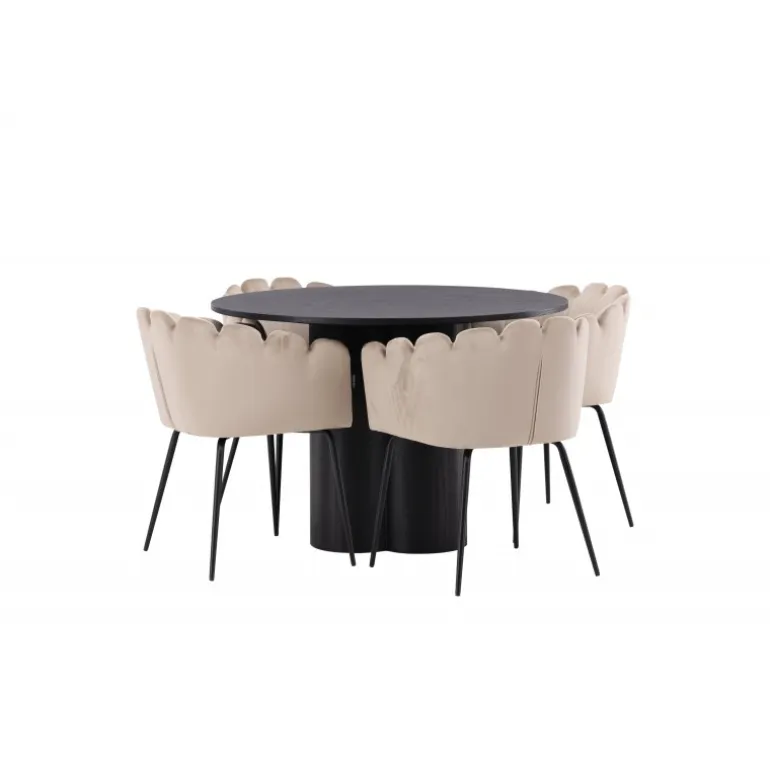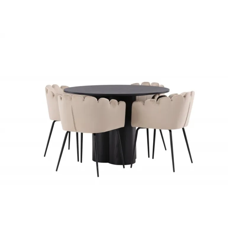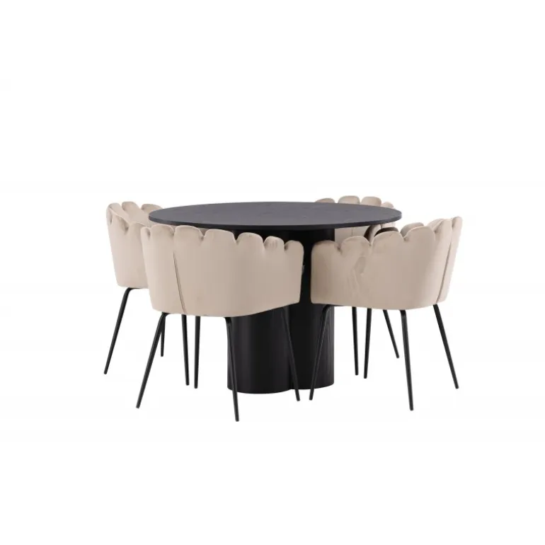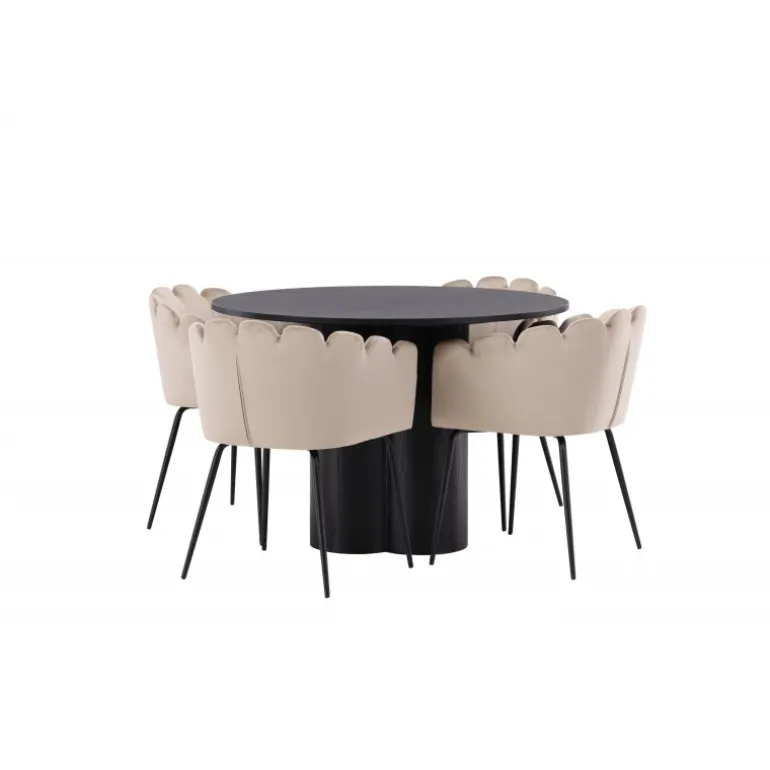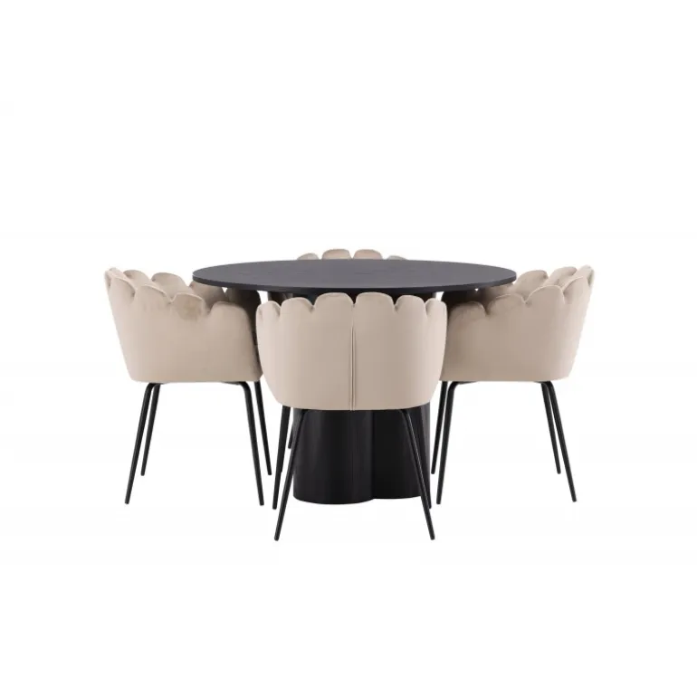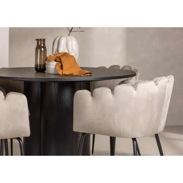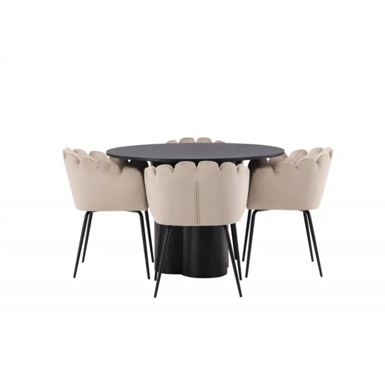 Sid komfortabelt og inviter til sociale måltider i fremtiden – her ender ingen på kanten. Spisebordet Olivia imponerer med sit skandinaviske og smagfulde design. Bordet har et samlet holistisk design i en populær mocca farve. Den runde top er i MDF, og rammen består af tre cylinderformede ben, der samles under midten af bordet. Her i perfekt match med vores luksuriøse stole fra Limhamn-serien. Stolen har et indbydende design med dekorativt muslingformet ryg med dekorative syninger og et rundt sæde i dejligt beige velourstof. Benene er i sort pulverlakeret metal. En perfekt Spisebordssæt i et moderne look!