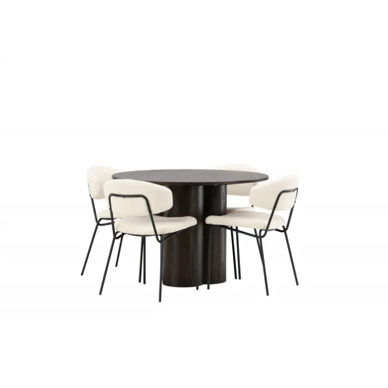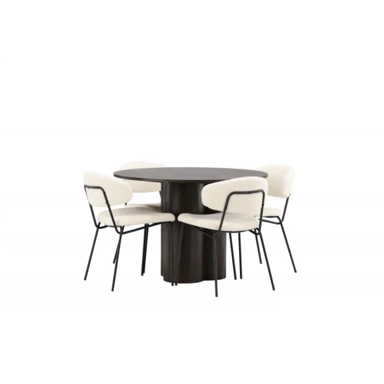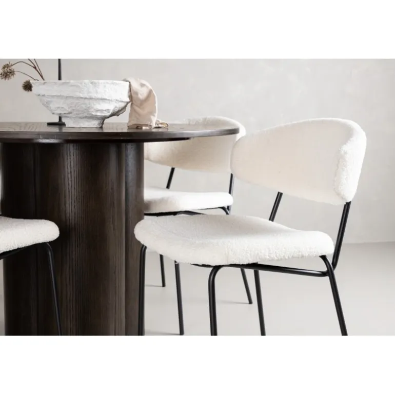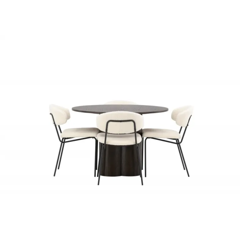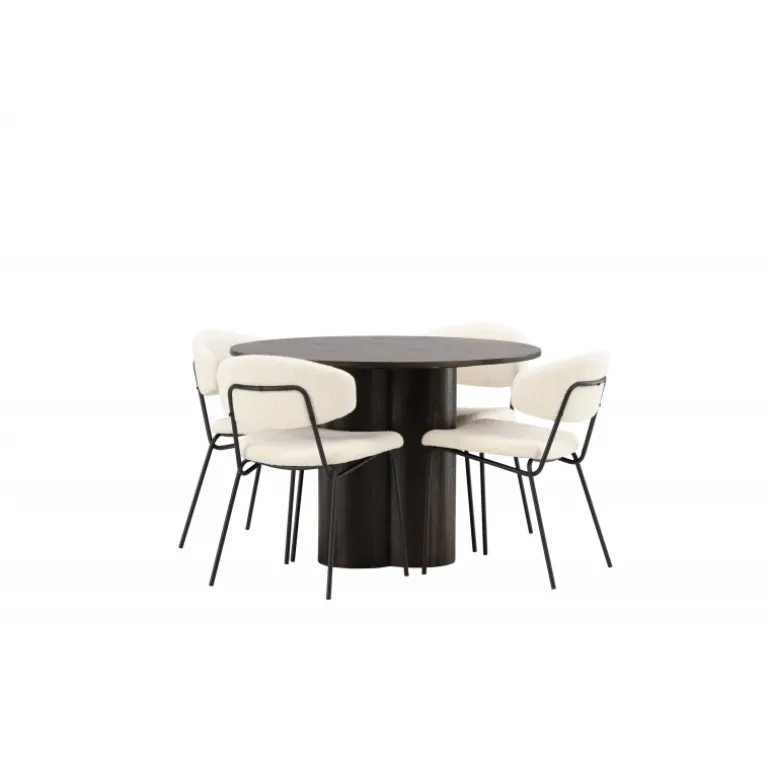 - Materialer af høj kvalitet: Bord i MDF og finer, stole i hvid boucléstof og sort stålramme.