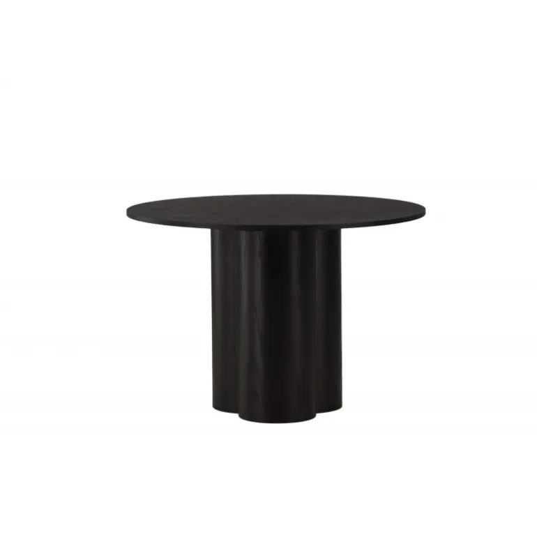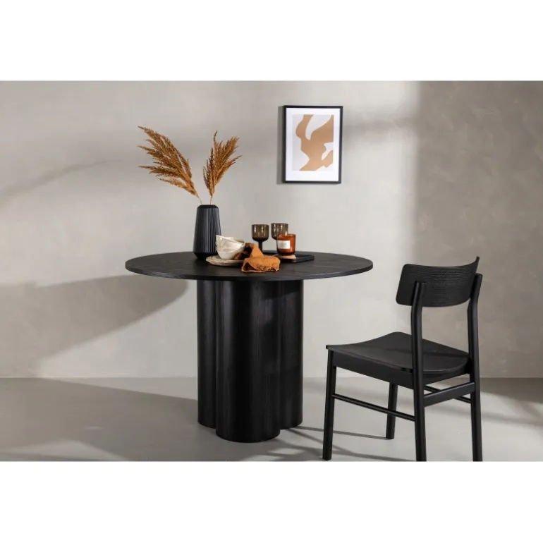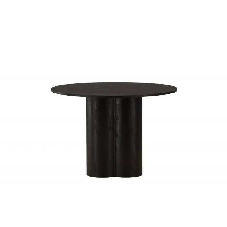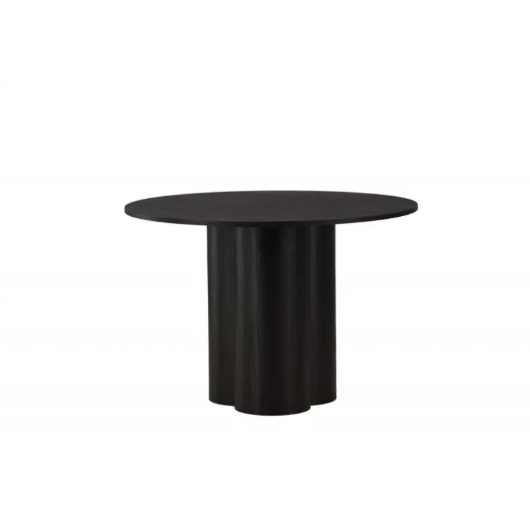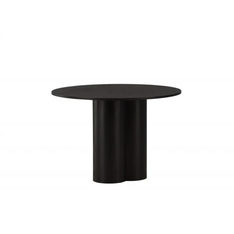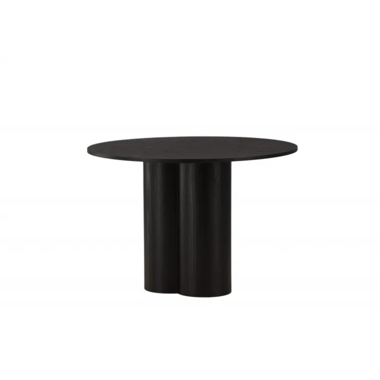 Olivia Spisebord imponerer med sit skandinaviske design og smagfulde udtryk! Rundt spisebordet har et ensartet design i sort MDF med en tynd, rund bordplade og tre cylindriske ben, der samles under midten af bordet. Farven har en let dækning på den finerede plade, hvilket gør materialet synligt og giver liv og bevægelse til møblet. Skab en stilfuld blikfanger i hjemmets hjerte – her ender ingen på kanten!