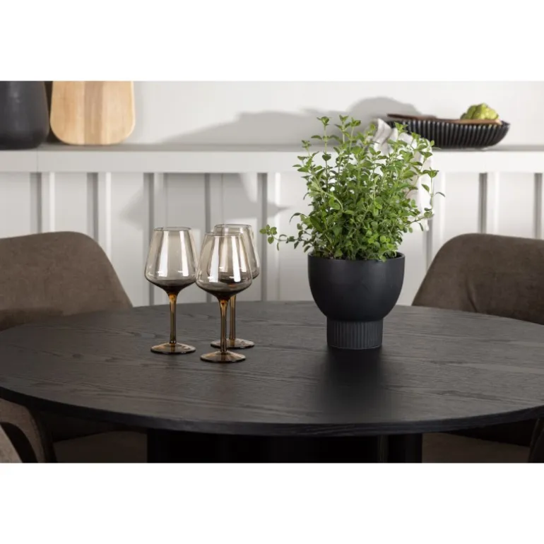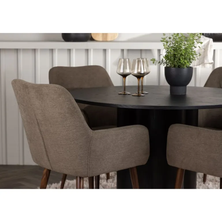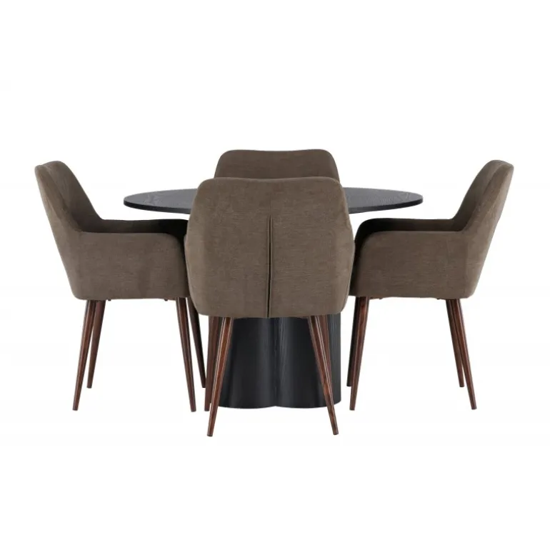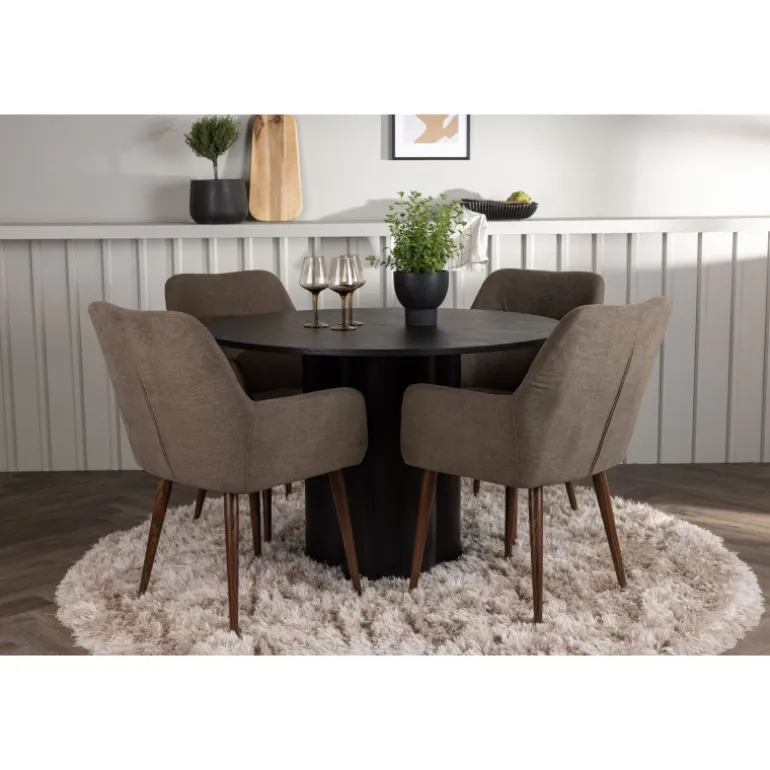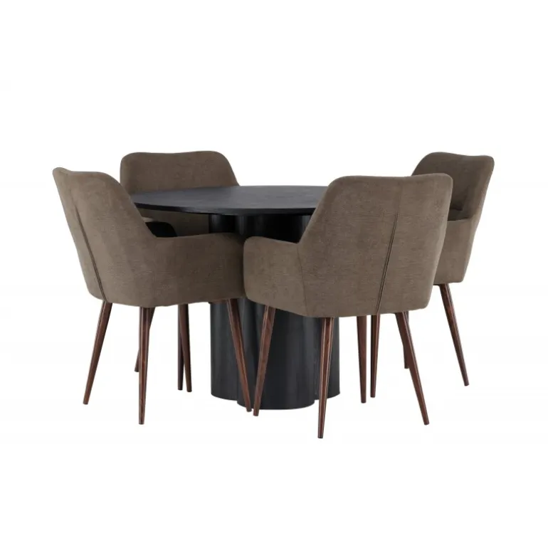 Skab stil og komfort i dit hjem med dette indbydende Spisebordssæt – en perfekt kombination af design og komfort! Vores runde spisebord Olivia er fremstillet med omhu og eksklusivitet for øje. Den konsekvente sorte farve tilføjer et sofistikeret touch til rummet, mens den tynde, runde topflade lavet af bæredygtigt MDF-materiale giver et moderne udtryk. Bordets tre cylinderformede ben, pænt samlet under midten af bordet, tilbyder en stabil og robust base. Bordets dimensioner: 110 cm. Sammen med spisebordet leveres vores brune spisebordsstole fra Tomorrow-serien. Du vil elske at sidde i disse komfortable stole og nyde lange, hyggelige måltider. Stolens brune polyesterstofsæde med integrerede armlæn tilbyder dejlig komfort, mens stoles ben i en moderne valnøddebrun farve giver en stilfuld kontrast til bordets elegante design. Dette moderne Spisebordssæt er det bedste valg for dem, der søger en elegant og funktionel indretning til deres hjem. Med sin skandinaviske design og smagfulde sammensætning vil dette spisebord og dets matchende stole bringe en tidløs charme til din stue eller køkken.