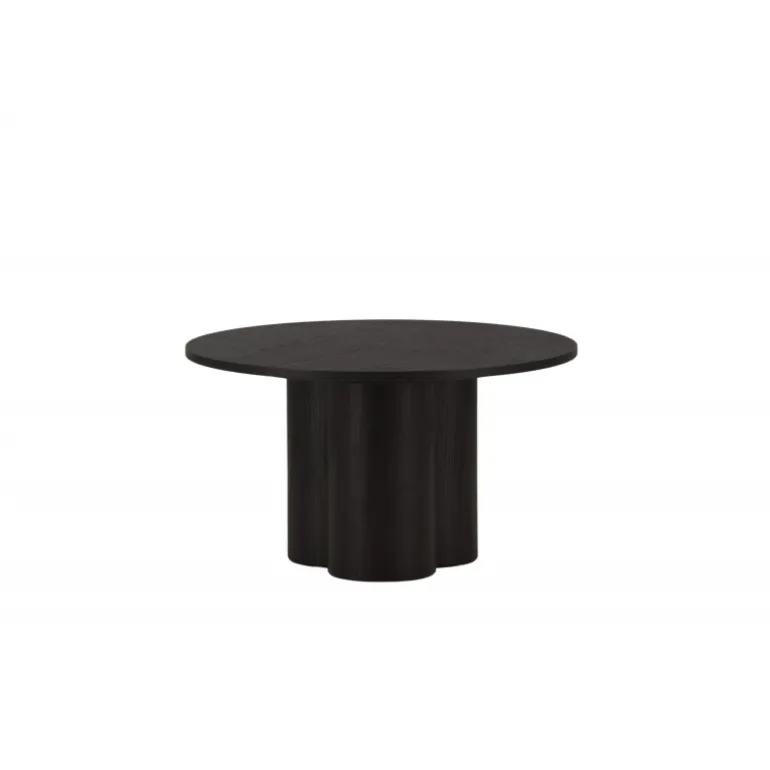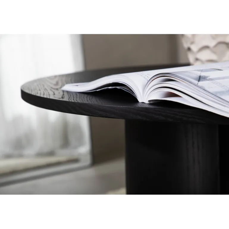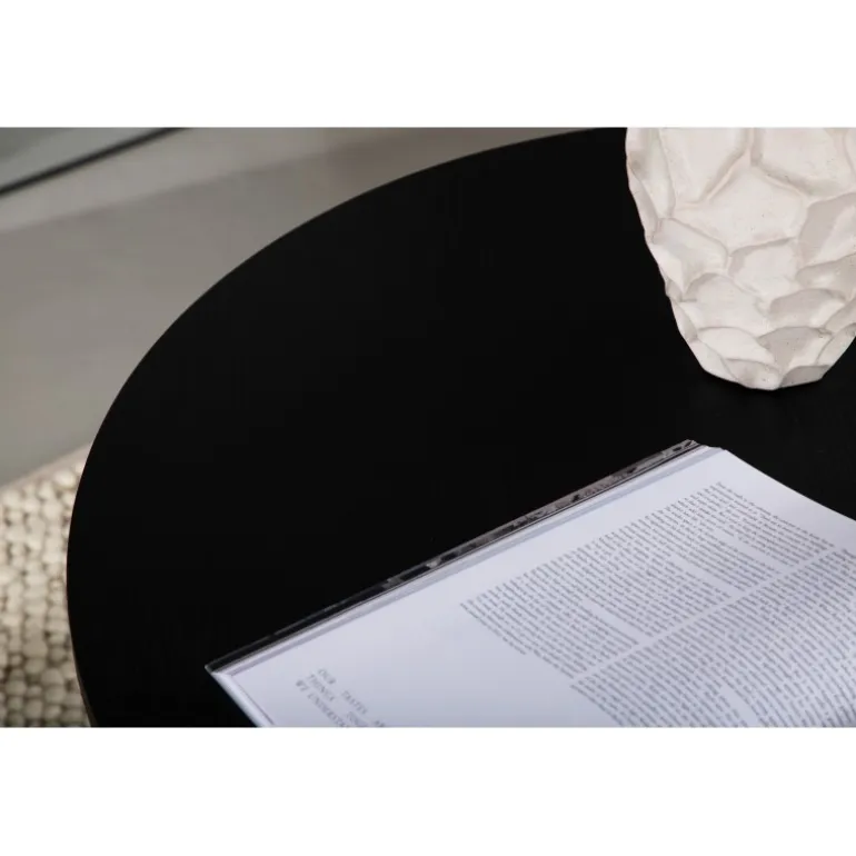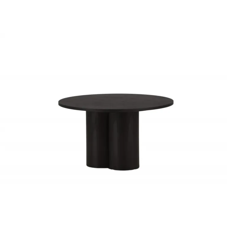 Tag din indretning til næste niveau med et sofabord, der topper trendlisterne! Olivia sofabord er lavet af sort MDF med finer og har en cylindrisk struktur, der skaber en lækker dimension til bordet. Den runde topplade er fineret, og kroppen består af tre cylinderformede ben, samlet under midten af bordet. Bordet er utroligt alsidigt både som sofabord og sidebord, og den nette størrelse gør det nemt at placere og flytte rundt i hjemmet. Her får du et moderne sidebord, der imponerer med sine bløde former, stilfulde design og trendsikre farve!