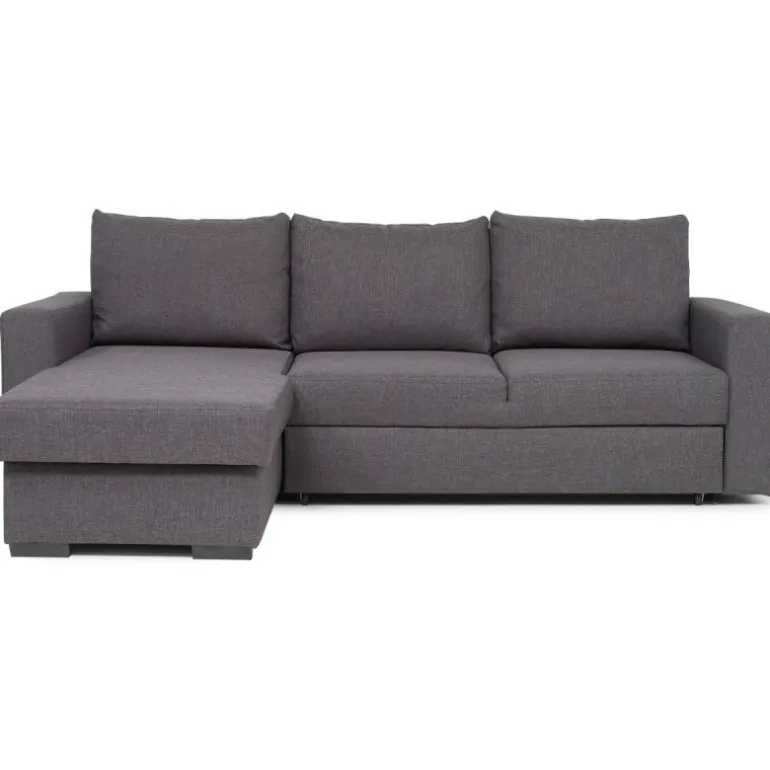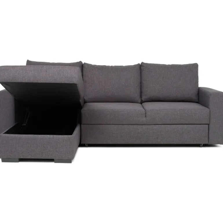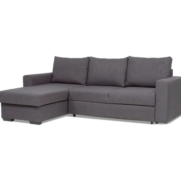 Olivia sovesofa i slidstærkt og praktisk gråt strukturvævet stof, en populær lille sovesofa med vendbar chaiselong, som tåler daglig brug og er utrolig nem at slå ud. Sofaen har magasin i chaiselongen til praktisk opbevaring af sengetøj. Olivia sovesofaen er vendbar så man også senere kan få sofaen til at passe ind i boligindretningen. Olivia er polstret med koldskum i sædet hvilket giver en medium/fast ligge- og siddekomfort. Udtræksdelen er polstret med sort møbelstof.