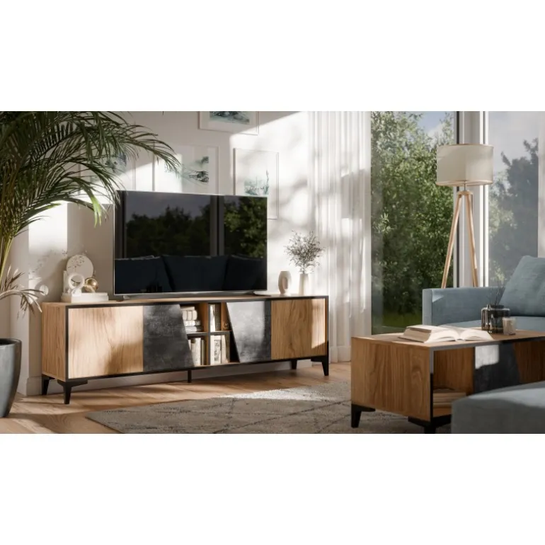 OVO TV bord i mørk beton og ur-eg er den perfekte tilføjelse til dit moderne hjem. Med dimensioner på højde 53 cm, bredde 180 cm, dybde 38 cm tilbyder dette TV bord rigelig plads til dine underholdningsenheder. Lavet af lamineret mat spånplade på både over- og underkanter samt sider og fronter, er dette møbel både robust og stilfuldt. De plastikben med en højde på 120 mm og ‘push to open’-håndtag gør det nemt at anvende og giver det et strømlinet udseende.