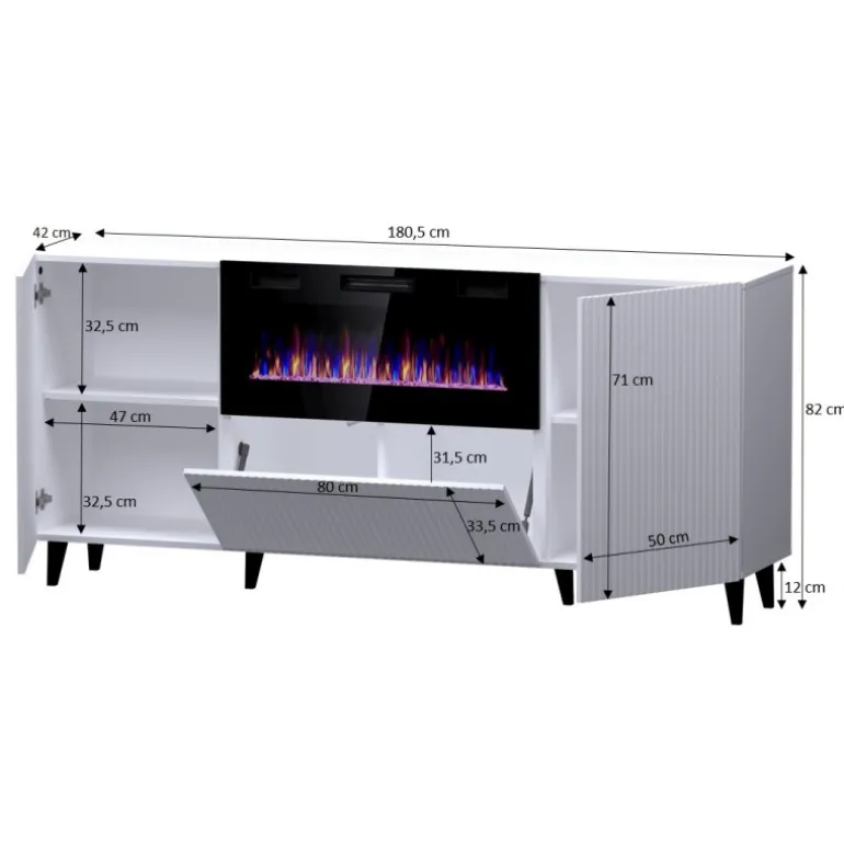 PAFOS kommode EF 180 hvid/hvid er en elegant og funktionel løsning til dit hjem. Denne kommode tilbyder muligheden for at installere en pejs, som kan bestilles separat (CAMA-KOMINEK). Med dimensionerne højde: 82 cm, bredde: 180,5 cm, og dybde: 40 cm passer den perfekt i ethvert rum. Kroppen er lavet af 16 mm lamineret mat spånplade, mens frontene er lavet af 16 mm lamineret MDF-plade beklædt med folie og synlige udskæringer. Kanten er lavet af ABS, og benene er af plastmateriale. Der er ingen håndtag, da frontene rækker ud over toppen, hvilket giver et stilrent og moderne look.