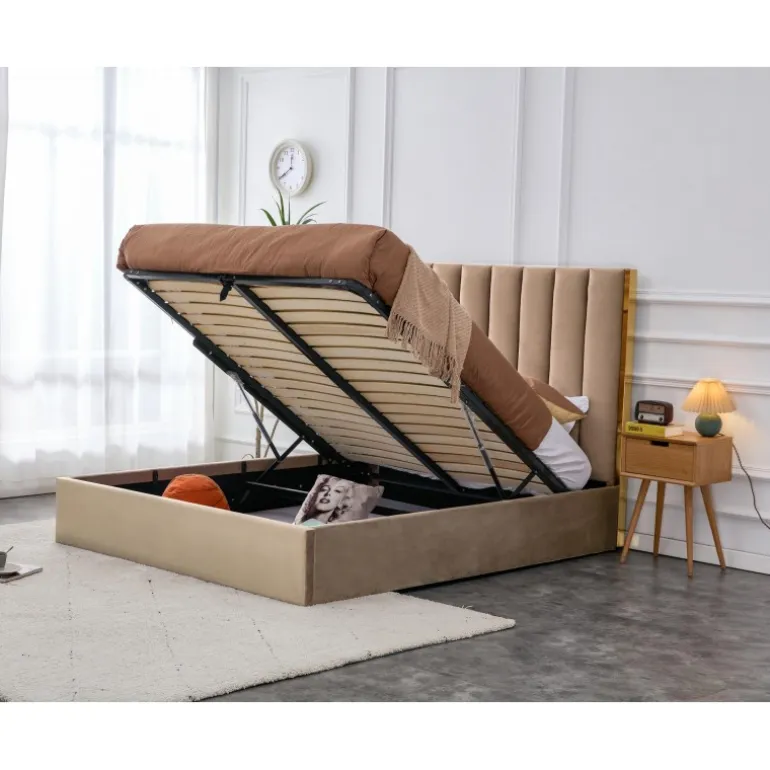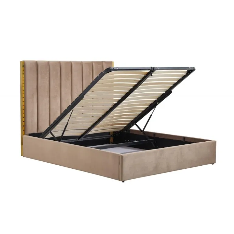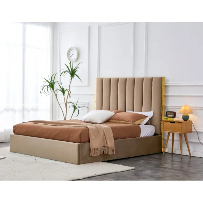 Oplev luksus og komfort med PALAZZO 160 seng, designet til at forvandle dit soveværelse til en elegant oase. Denne seng er fremstillet af høj kvalitets velourstof og rustfrit stål i en stilfuld kombination af beige og guld. Med en praktisk sengeboks til opbevaring af sengetøj, er denne seng både funktionel og æstetisk tiltalende. Bemærk, at sengen leveres uden madras, men valgfri madrasser som POLARIS 160 eller SYRIUSZ 160 kan tilføjes for optimal komfort.